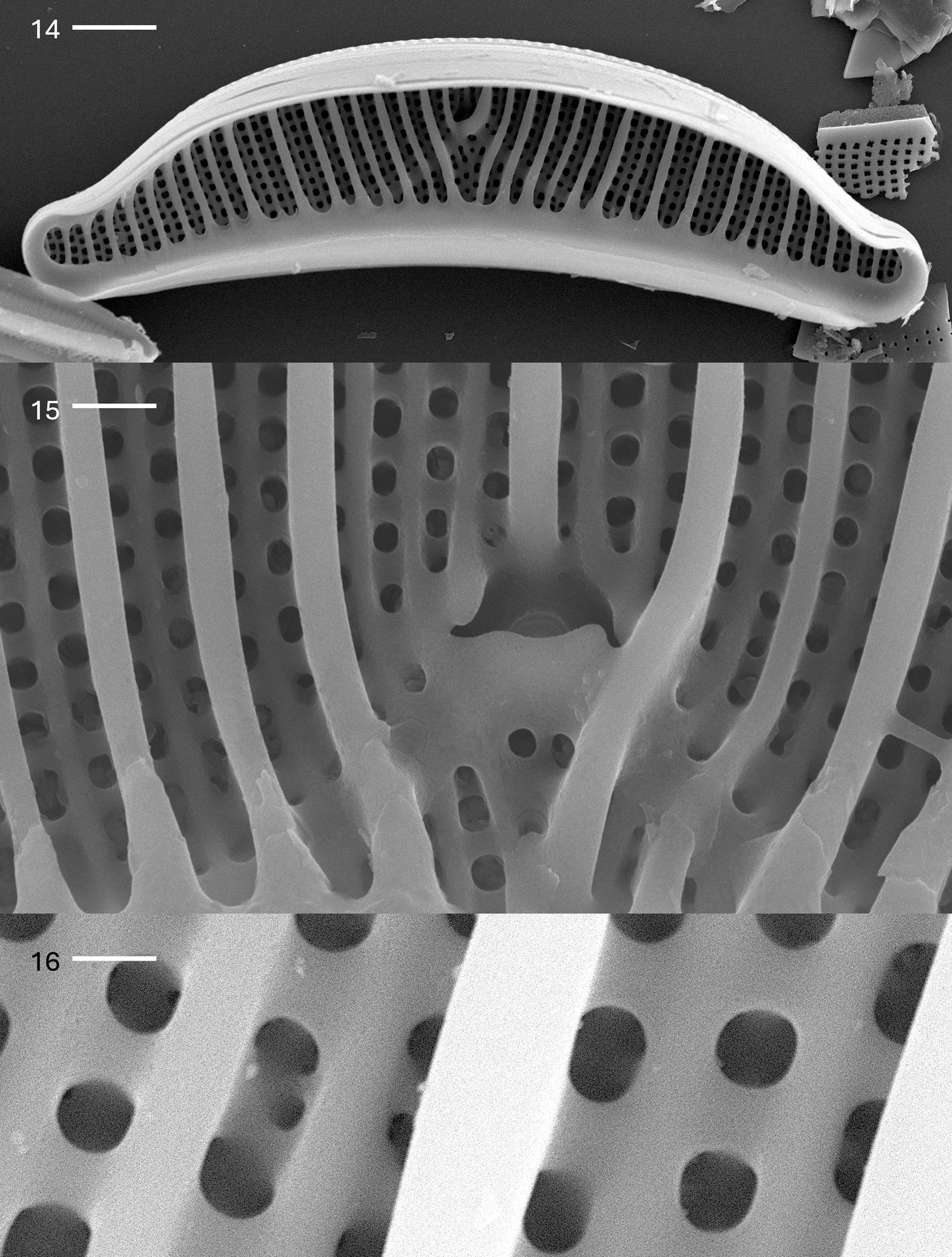 Plate 2Epithemia capitata (Tempère & M. Peragallo) Kociolek et al., comb. nov., stat. nov. (14–16) SEM. Internal views. (14) Valve view. Costate fibulae are evident. A large central area is present. The canal raphe is narrow. The scale bar is 10 µm. (15) The central area is comprised of a cave-like area. The scale bar is 2 µm. (16) Areolar openings and costate fibulae are evident. The scale bar is 2 µm.