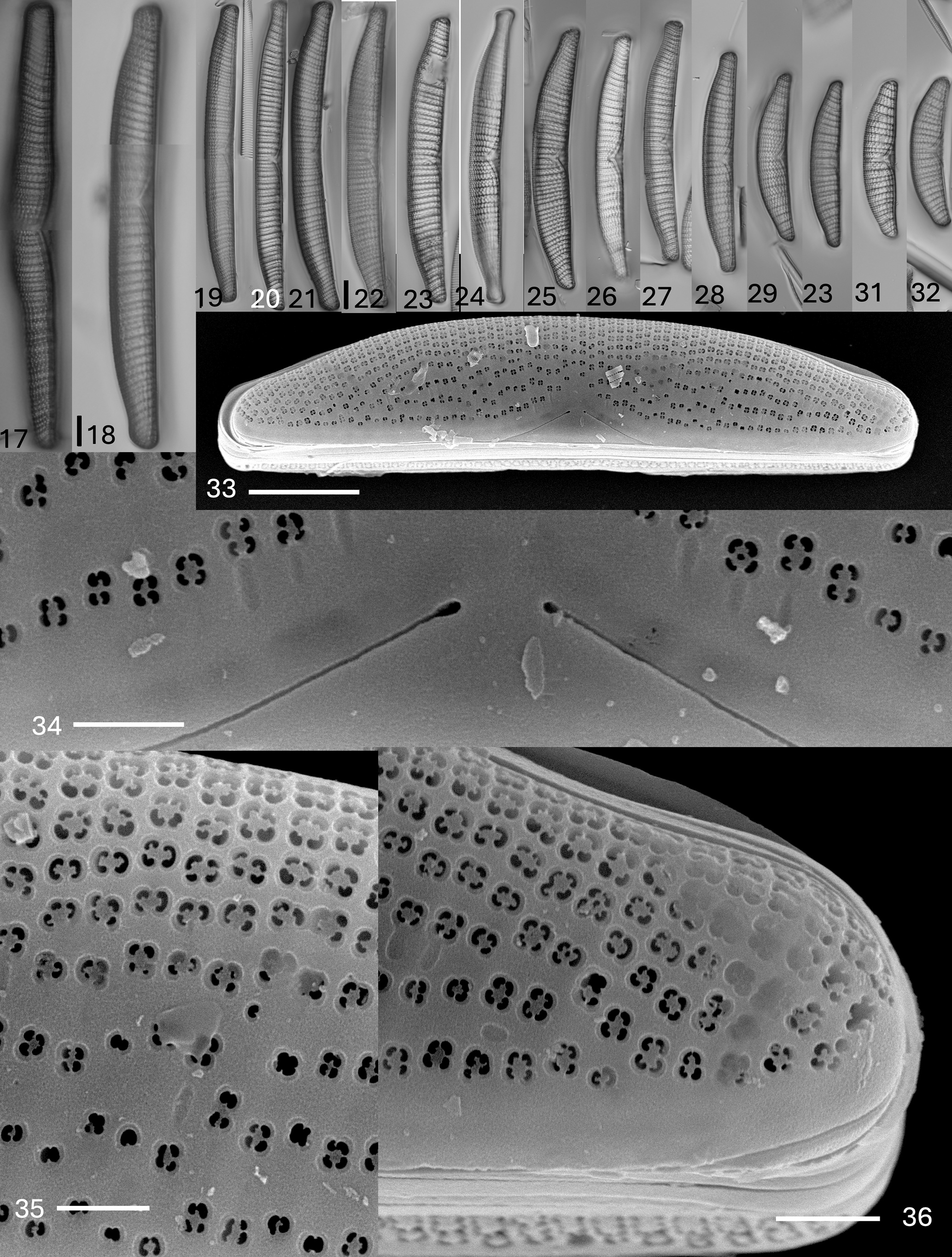 Plate 3Epithemia debilis (Tempère & M. Peragallo) Kociolek et al., comb. nov., stat. nov. (17–32) Light microscopy, valve views. Size diminution series. Figure (17) is of an initial valve. The scale bar shown in (17) is 10 µm for (17) and (18); the scale bar shown in (22) is 10 µm for (19)–(32). (33–36) SEM. External views. (33) Entire valve view. Striae have denser areolae towards the dorsal margin as compared to the ventral margin. Areolae are absent ventrally in the proximal raphe ends. The scale bar is 10 µm. (34) Central area showing proximal raphe ends. Areolae are sunken with four openings. The scale bar is 2 µm. (35) Dorsal margin showing the density of areolae in striae. The scale bar is 2 µm. (36) Apex, showing the density of areolae. The scale bar is 2 µm.