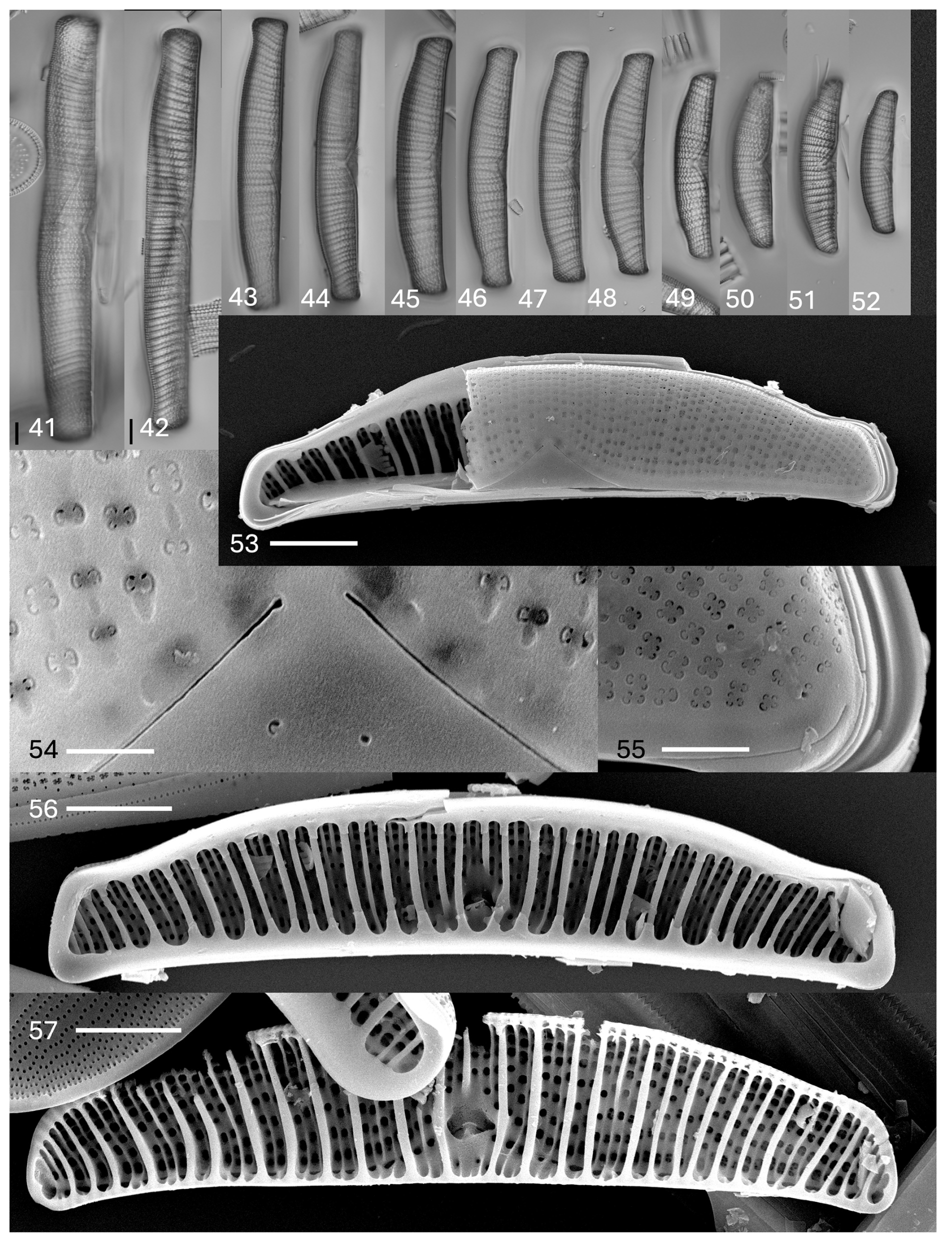 Plate 5Epithemia truncata M. Peragallo in Tempère & Peragallo. (41–52) Light microscopy, valve views. Size diminution series. Figure (41) shows an initial valve. The scale bar shown in (41) is 10 µm, and the scale bar shown in (42) is 10 µm for (42)–(52). (53–57) SEM. (53–55) External views. (53) Partial valve showing striation and proximal raphe ends. The scale bar is 10 µm. (54) Central area with proximal raphe ends evident. The areolae are nearly absent ventrally at the proximal raphe ends. The areolae may have two to four openings. The scale bar is 1 µm. (55) Apex, showing raphe on the ventral margin extending onto the mantle at the valve terminus. The scale bar is 1 µm. (56, 57) Internal views. (56) Specimen has girdle bands with extensions overlaying the costate fibulae and short septa at the poles. The scale bar is 10 µm. (57) Specimen without girdle bands. Costate fibulae and canal raphe are evident. The scale bar is 10 µm.