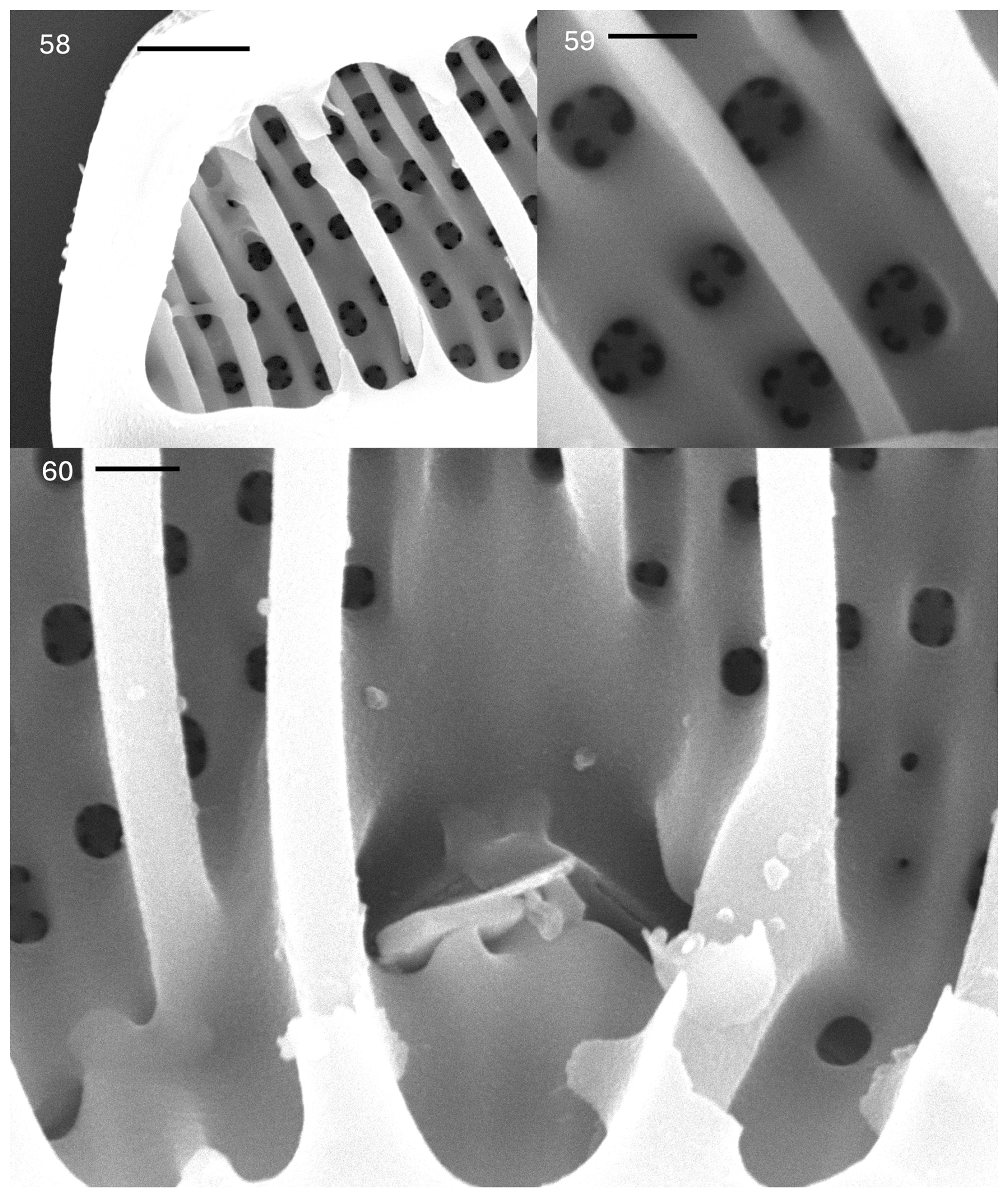 Plate 6Epithemia truncata M. Peragallo in Tempère & Peragallo. (58–60) SEM. Internal views. (58) Apex of the valve showing short septum and round internal openings of the areolae. The scale bar is 2.5 µm. (59) Valve face showing round internal areolar openings with two to four openings externally. The scale bar is 1.0 µm. (60) Central area, with proximal raphe ends that are discontinuous. The scale bar is 1.0 µm.
