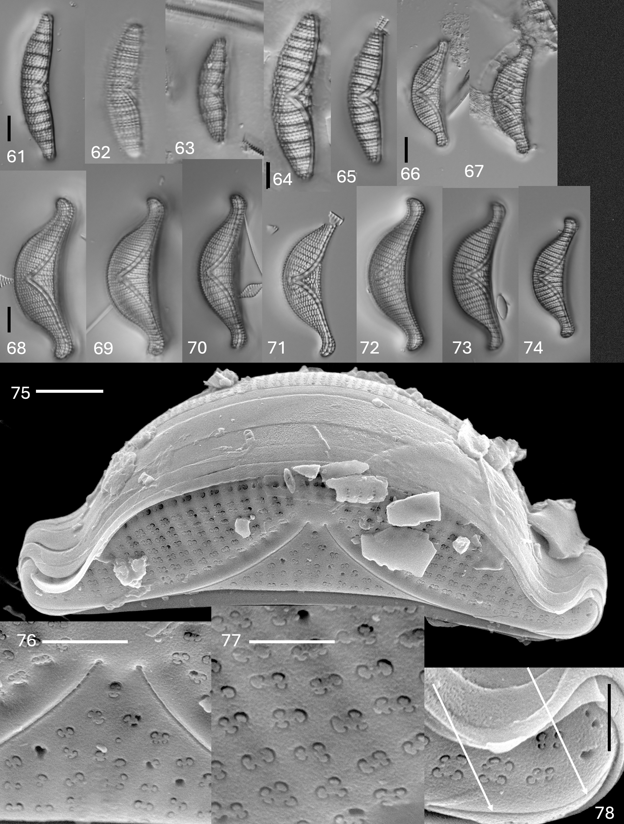 Plate 7(61–74) Light microscopy. (61–63) Epithemia cf. adnata. (64–65) Epithemia argus cf. longicornis. (66–67) Epithemia sorex Kützing. (68–74) Epithemia pseudoamphicephala Kociolek et al., sp. nov. Figure (69) shows the holotype specimen. The scale bar shown in (61) is 10 µm for (61)–(63). The scale bar shown in (64) is 10 µm for (64) and (65). The scale bar shown in (66) is 10 µm for (66) and (57). The scale bar shown in (68) is 10 µm for (68)–(74). (75–78) SEM. External views. Epithemia pseudoamphicephala Kociolek et al., sp. nov. (75) Whole valve. A biarcuate raphe is evident. The scale bar is 5 µm. (76) Central area with proximal raphe ends. The scale bar is 2 µm. (77) Valve face showing striae with areolae with two to four openings with volate occlusions. The scale bar is 1 µm. (78) Apex of the vale. Arrows indicate the raphe branch. The scale bar is 2 µm.
