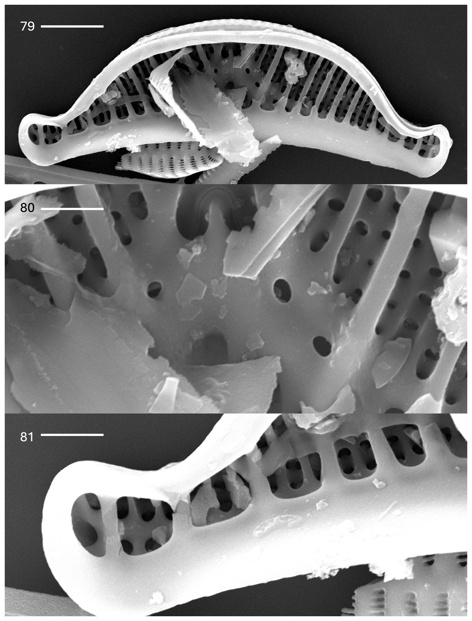 In the SEM, the exterior is covered by rows of areolae that are in groups of two to four (Plate 7, figs. 75–78). Each areola is occluded by a vola, giving a characteristic C shape to the opening. The valve face is smooth, without domed coverings or openings (Plate 7, figs. 75–78). The raphe is within a narrow axial area, located about mid-way on the apices, arching strongly towards the ventral margin and then arching onto the valve face and terminating in the center near the dorsal margin (Plate 7, figs. 75 and 76). Numerous girdle bands, some of the open type, are present. Internally, the raphe canal is wide and has small portules (Plate 8, figs. 79 and 80). Near the dorsal margin, the raphe can be seen to be continuous over the central nodule (Plate 8, fig. 80). Extensions from the girdle bands are nearly continuous near the apices but cover only a short segment of the costate fibulae near the center (Plate 8, fig. 81).