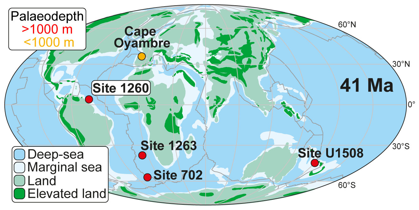 Figure 1Palaeogeographic map at 41 Ma, modified from Peñalver-Clavel et al. (2024), showing the location of sites where the LLTM has been studied, including their palaeobathymetry.