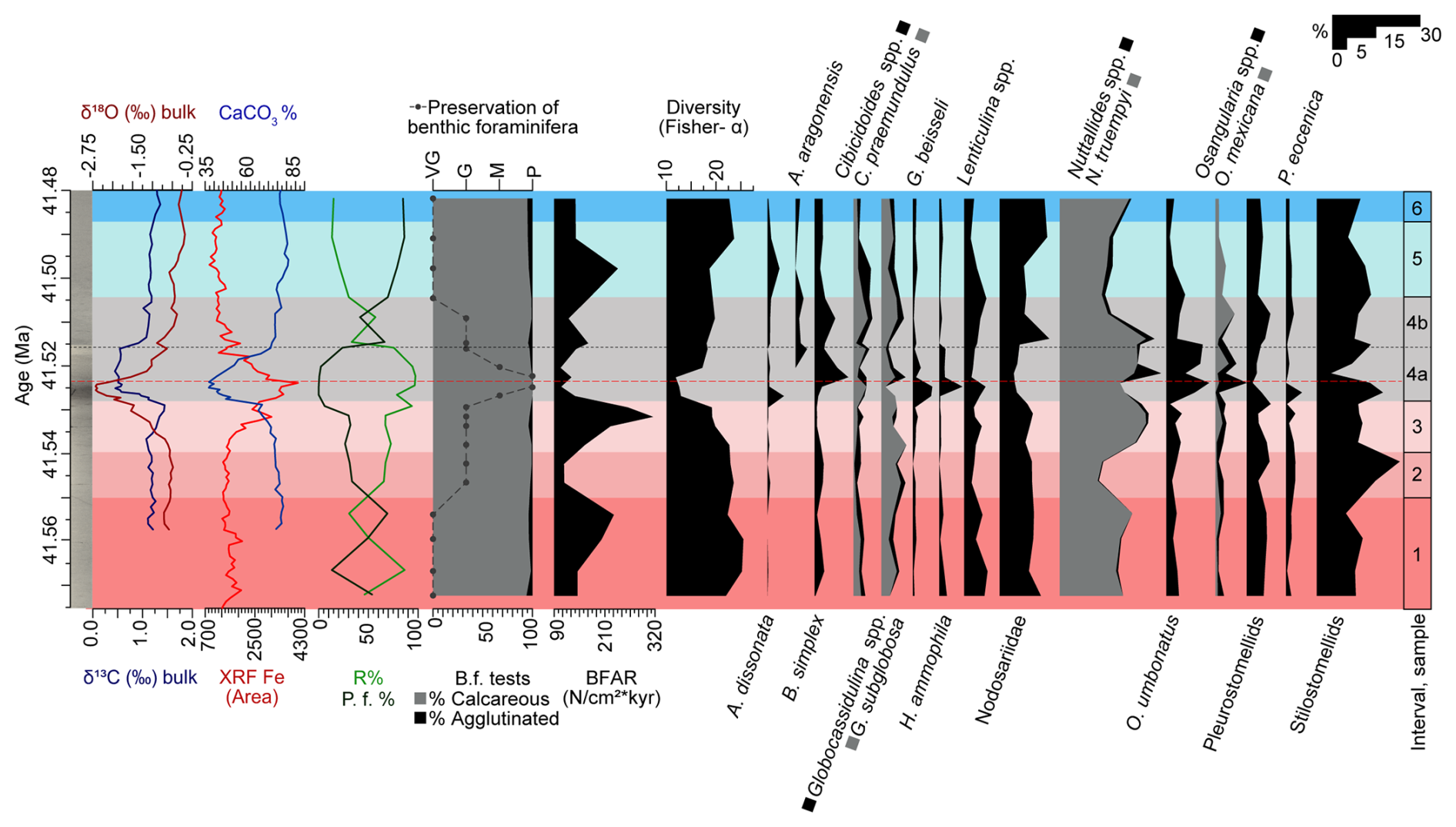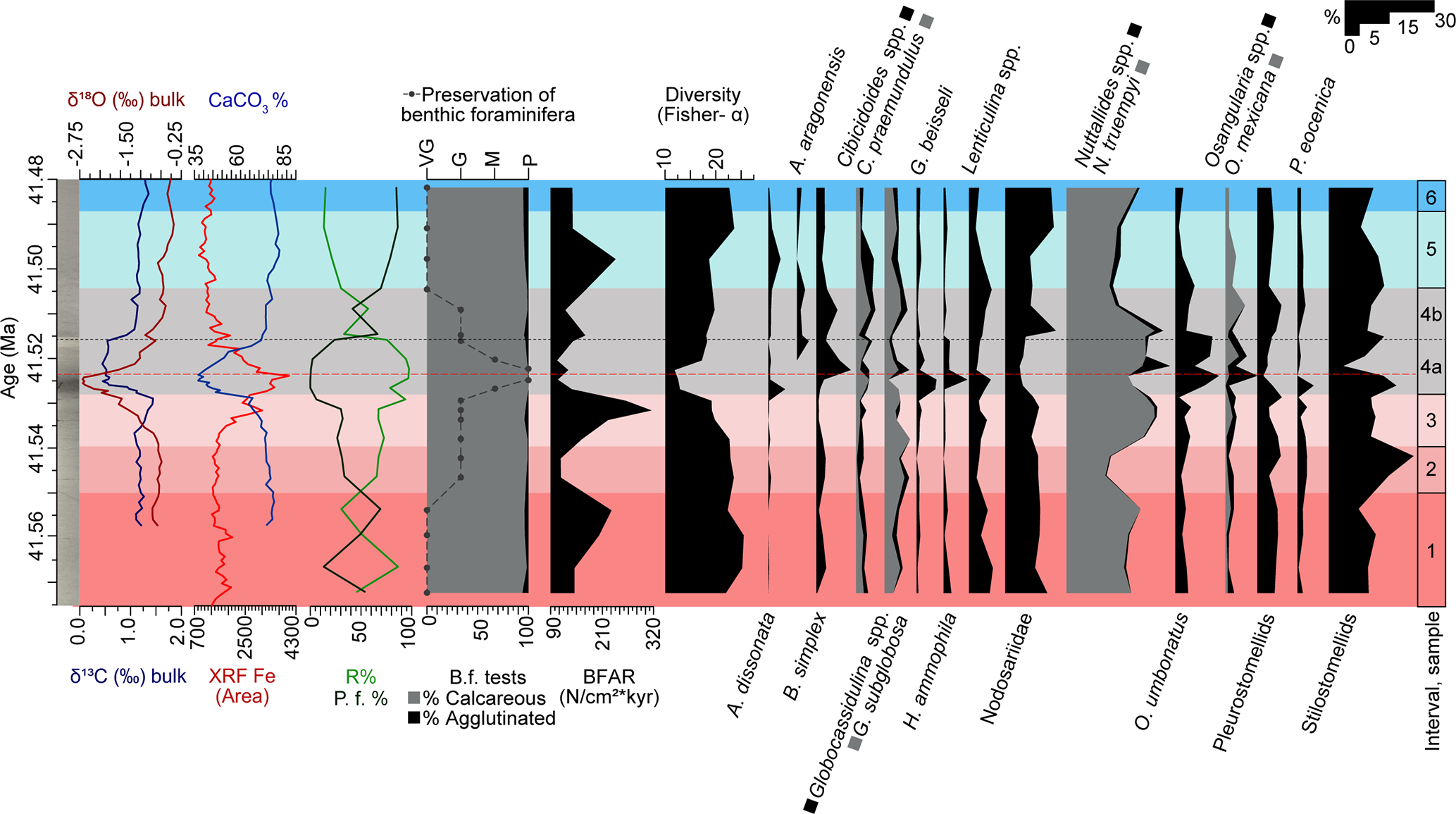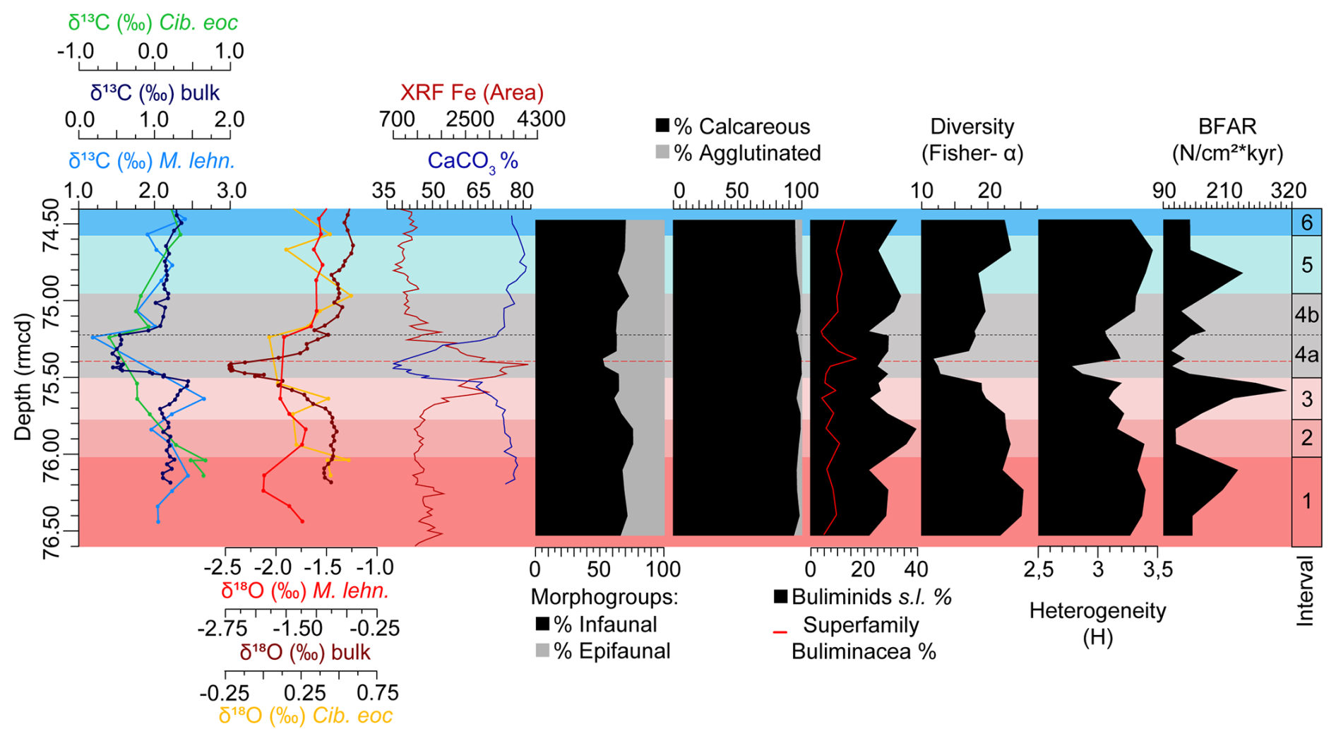 Changes in diversity and in the relative abundance of benthic foraminiferal taxa, coupled with corresponding shifts in geochemical proxies, enabled the identification of six intervals.