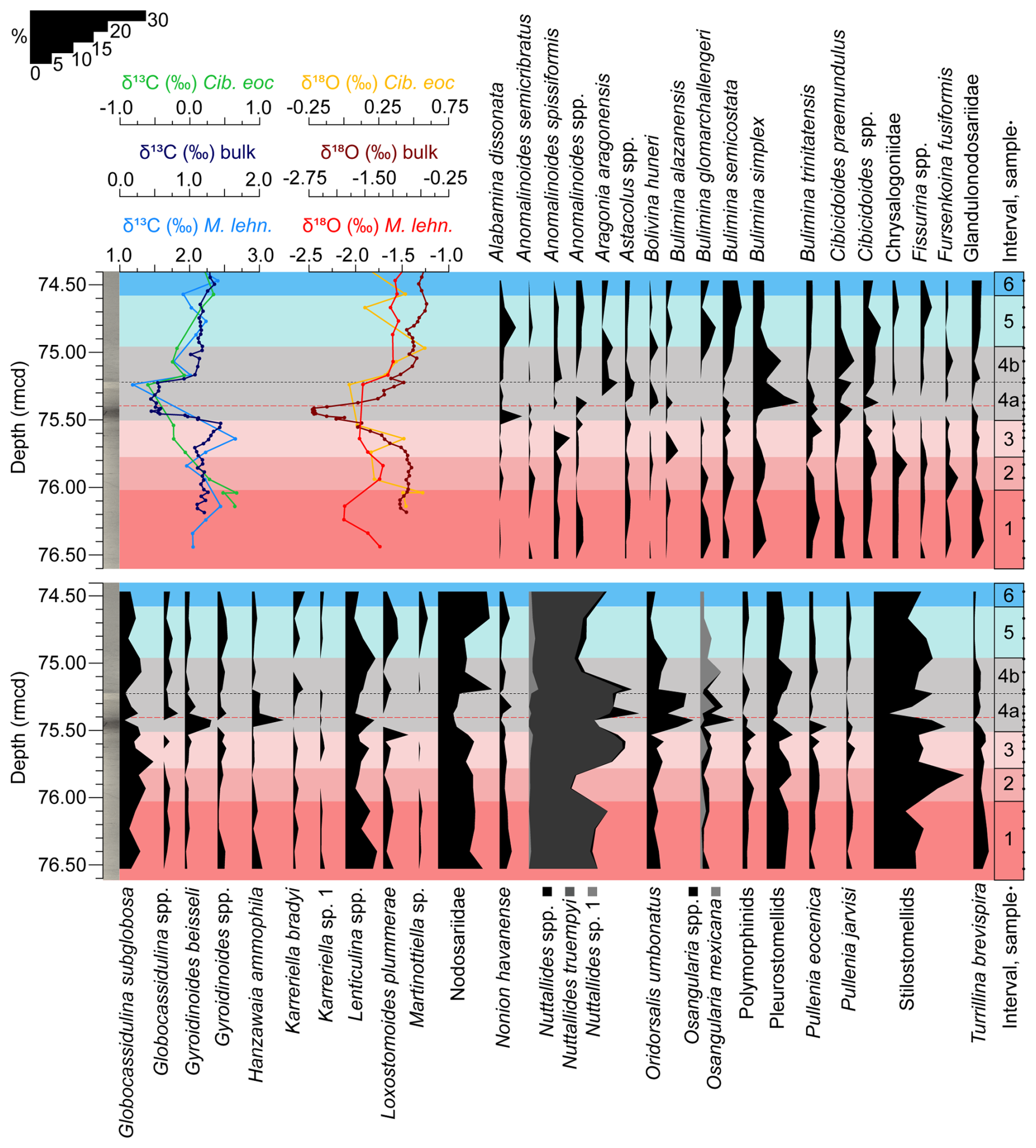 Benthic foraminiferal assemblages at ODP Site 1260 are dominated by calcareous taxa and indicate deposition above the calcite compensation depth. Nuttallides truempyi and stilostomellids are dominant at this site, and they are predominantly found at lower bathyal and abyssal depths during the Eocene, with the latter most common between 1000 and 3000 m (Pflum and Frerichs, 1976; Tjalsma and Lohmann, 1983; Katz et al., 2003). Abundant and common species at this site, such as Globocassidulina subglobosa, Anomalinoides spissiformis, Bulimina semicostata, Bulimina trinitatensis, Cibicidoides praemundulus, and Nonion havanense, are typical of lower bathyal to abyssal depths (Tjalsma and Lohmann, 1983; Van Morkhoven et al., 1986; Hayward et al., 2001, 2004, 2010). Other bathyal to abyssal species include Oridorsalis umbonatus, Bulimina glomarchallengeri, and Aragonia aragonensis (Tjalsma and Lohmann, 1983; Van Morkhoven et al., 1986; Alegret et al., 2009; Arreguín-Rodríguez et al., 2018). Middle bathyal to abyssal taxa (Anomalinoides semicribratus, pleurostomellids) (Tjalsma and Lohmann, 1983; Van Morkhoven et al., 1986; Bignot, 1998) are also present. Turrillina brevispira is an outer neritic to lower bathyal species, and it also occurs at abyssal sites (Van Morkhoven et al., 1986).