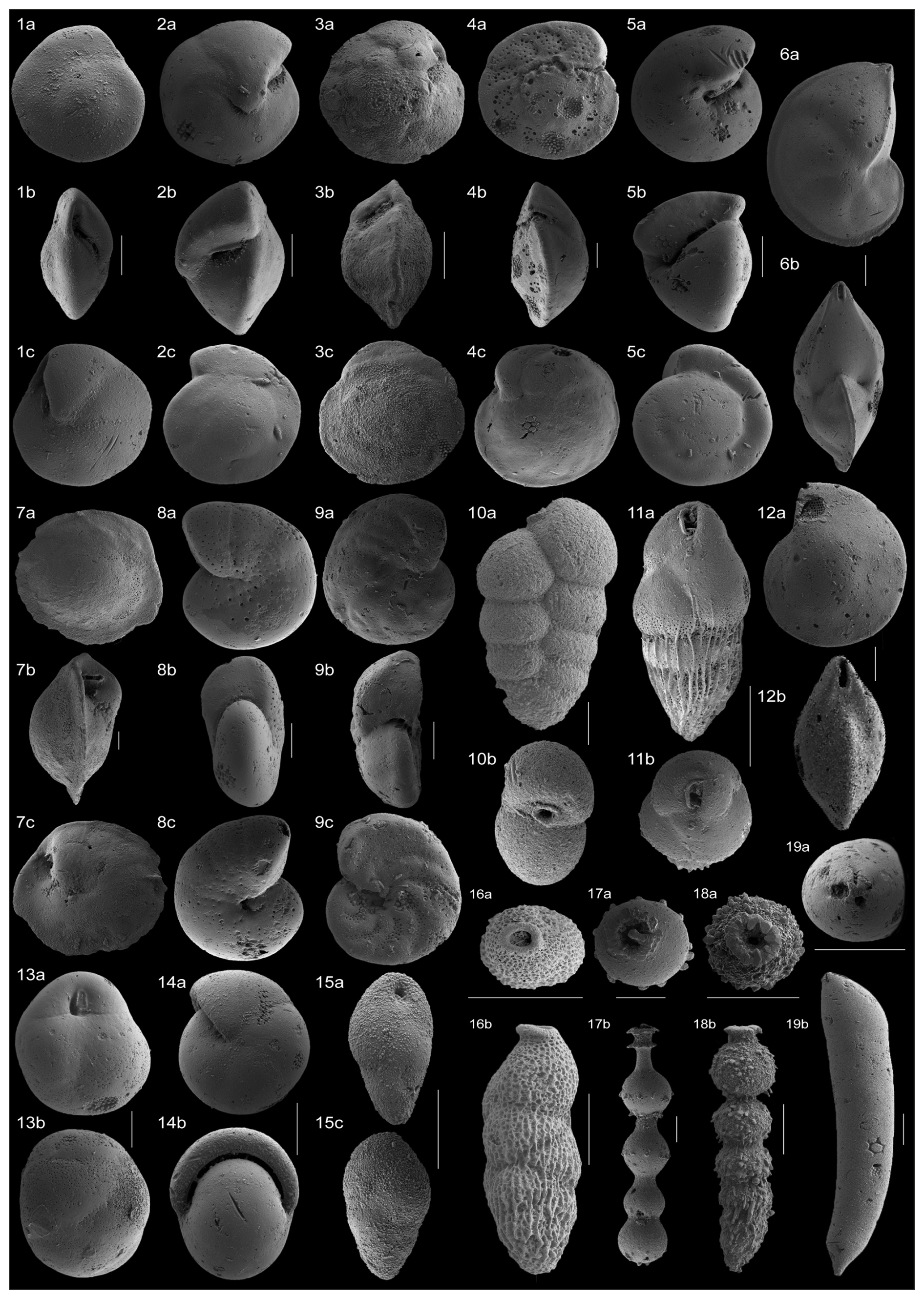 Figure 4SEM images of the benthic foraminiferal taxa that make up >4 % of the assemblages across the study interval. (1a–c) Alabamina dissonata, sample 1260A, 9R (6, 115–117 cm); (2a–c) Oridorsalis umbonatus, sample 1260B, 5R (2, 122–124 cm); (3a–c) Nuttallides truempyi, sample 1260A, 9R (6, 65–67 cm); (4a–c) Cibicidoides praemundulus, sample 1260B, 5R (2, 122–124 cm); (5a–c) Gyroidinoides beisseli, sample 1260B, 5R (2, 92–94 cm); (6a–b) Lenticulina sp., sample 1260B, 5R (2, 75–77 cm); (7a–c) Osangularia mexicana, 1260A, 9R (5, 125–127 cm); (8a–c) Anomalinoides spissiformis, sample 1260A, 9R (5, 125–127 cm); (9a–c) Hanzawaia ammophila, sample 1260B, 5R (2, 122–124 cm); (10a–b) Karreriella bradyi, sample 1260B, 5R (2, 122–124 cm); (11a–b) Bulimina semicostata, 1260A, 9R (6, 65–67 cm); (12a–b) Lenticulina sp., 1260B, 5R (2, 65–67 cm); (13a–b) Globocassidulina subglobosa, 1260B, 5R (2, 75–77 cm); (14a–b) Pullenia eocenica, 1260A, 9R (6, 125–127 cm); (15a–b) Bulimina simplex, 1260B, 5R (2, 65–67 cm); (16a–b) Loxostomoides plummerae, 1260A, 9R (5, 125–127 cm); (17a–b) stilostomellid, 1260A, 9R (6, 85–87 cm); (18a–b) stilostomellid, 1260B, 5R (2, 4–6 cm); (19a–b) Nodosariidae, 1260B, 5R (2, 122–124 cm). All scale bars = 100 µm.