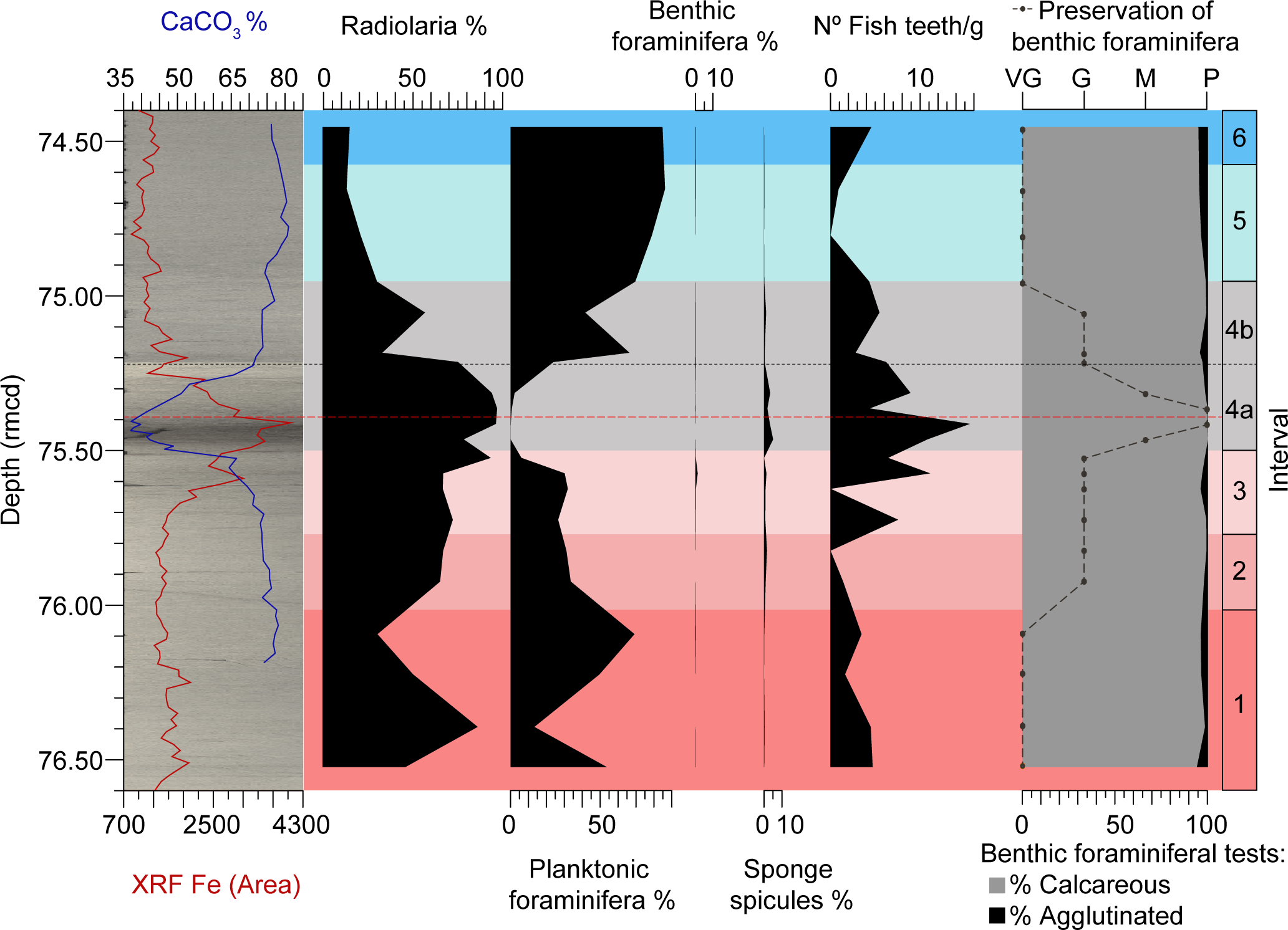 The integration of benthic foraminiferal results with the quantitative and semi-quantitative analyses of the other components of the sediment supports the scenario of CaCO3 corrosivity during the peak warming. The semi-quantitative analysis shows a drastic decrease in the percentage of planktic foraminifera, which are more susceptible to dissolution than benthic foraminifera (Nguyen et al., 2009), along with increased percentages of siliceous components such as radiolaria or sponge spicules. Regarding fish teeth, which are more resistant to carbonate dissolution due to their high phosphate content, a higher number of fish teeth per gram of sediment has been recorded (Figs. 6, 7). Benthic foraminifera also point to more corrosive bottom waters, as the worst preservation of their tests is observed across subinterval 4a (Figs. 6, 7) (Table S4).