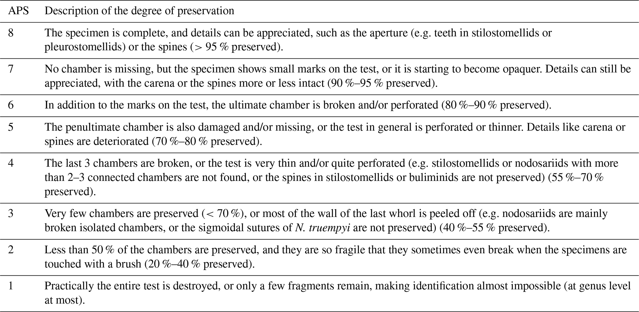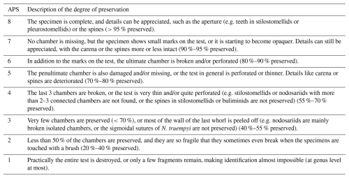 Additionally, a qualitative analysis of benthic foraminiferal test preservation was carried out across the study interval (Fig. 6). Following Boltovskoy and Totah (1992) and Nguyen et al. (2009), a scale to measure the preservation state of benthic foraminifera was employed. This assessment was applied to representative infaunal (Nodosariidae, Karreriella spp., stilostomellids, Bulimina spp., Oridorsalis umbonatus, Lenticulina spp., Globocassidulina subglobosa, and pleurostomellids) and epifaunal taxa (Osangularia spp., Nuttallides truempyi, Cibicidoides spp., Gyroidinoides spp., and Anomalinoides spp.) to evaluate whether both morphogroups were affected by carbonate corrosivity. A range of absolute preservation score (APS) on a scale from 8 to 1 was assigned to each identified taxon within a sample (Table 1; modified from Nguyen et al., 2009). Based on the observed APS ranges, the following preservation categories were established: very good (VG, APS ≥ 7), good (G, APS 6–8), moderate (M, APS 5–7), and poor (P, APS 2–6) (Table S4).