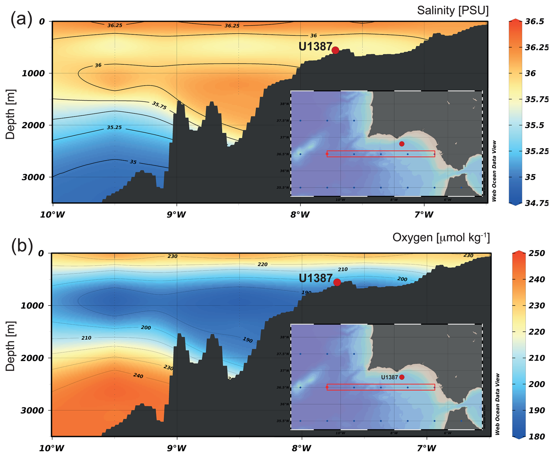 Figure 2Vertical sections of (a) salinity (PSU) and (b) dissolved oxygen (µmol kg−1) in the Gulf of Cadiz, with the location of the IODP Site U1387 marked by a red dot. Figures were made with Ocean Data View (ODV) software (Schlitzer, 2025) using the data package of Reagan et al. (2024). Temperature data are not shown but exhibit a similar distribution pattern to salinity.