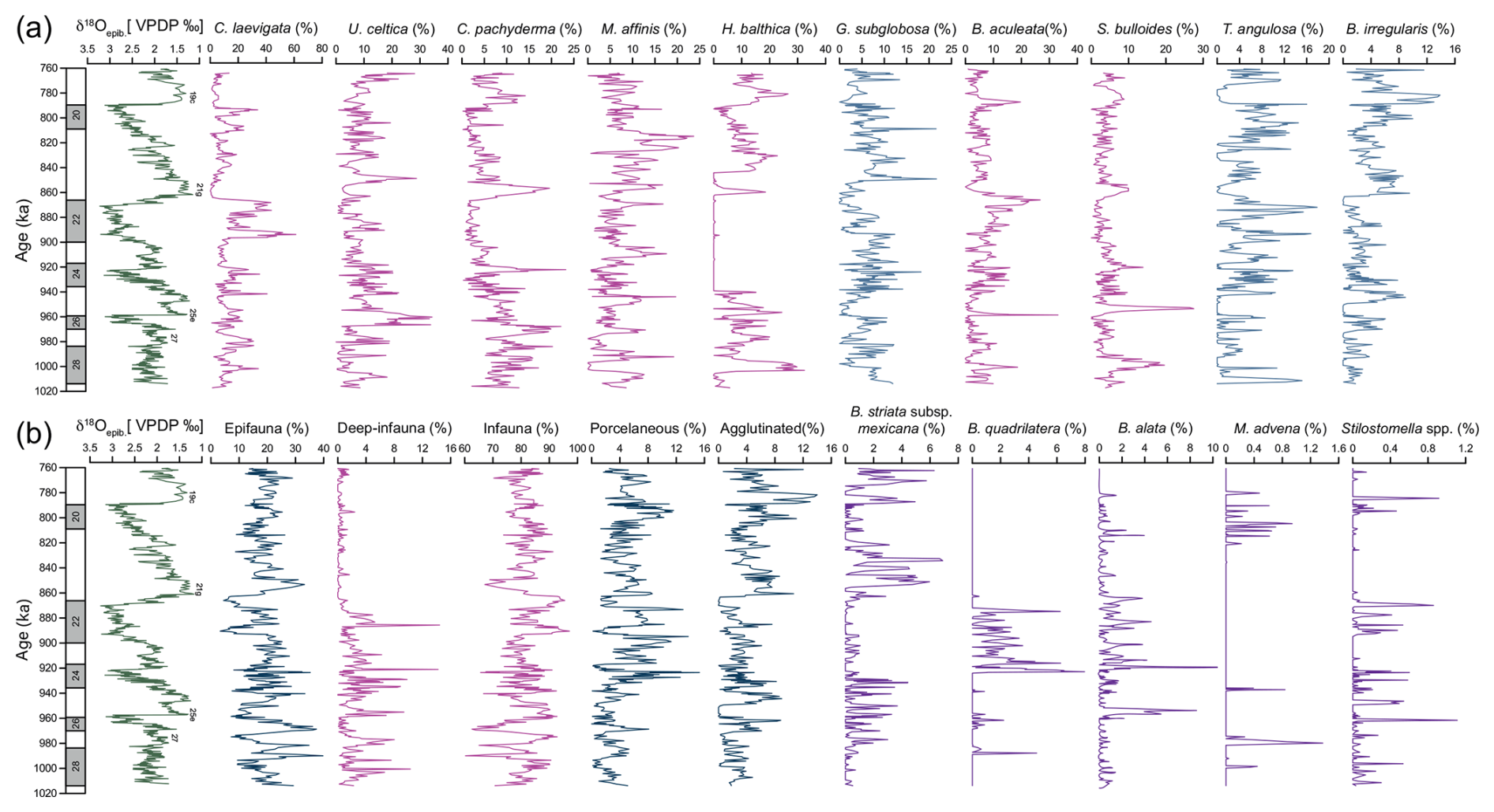 It is also worth noting that certain species exhibit similar or contrasting patterns of abundances such as Bulimina striata subsp. mexicana on one hand, and Bolivinita quadrilatera and Bolivina alata (Fig. 3b) on the other hand. B. striata subsp. mexicana reaches up to 8 % relative abundance during MIS 27, MIS 25, MIS 21, and MIS 19, intervals when B. quadrilatera and B. alata are generally absent or occur in very low percentages. In contrast, during MIS 28, MIS 23, and MIS 22, when B. striata subsp. mexicana is less abundant, B. quadrilatera and B. alata tend to show higher abundances.
