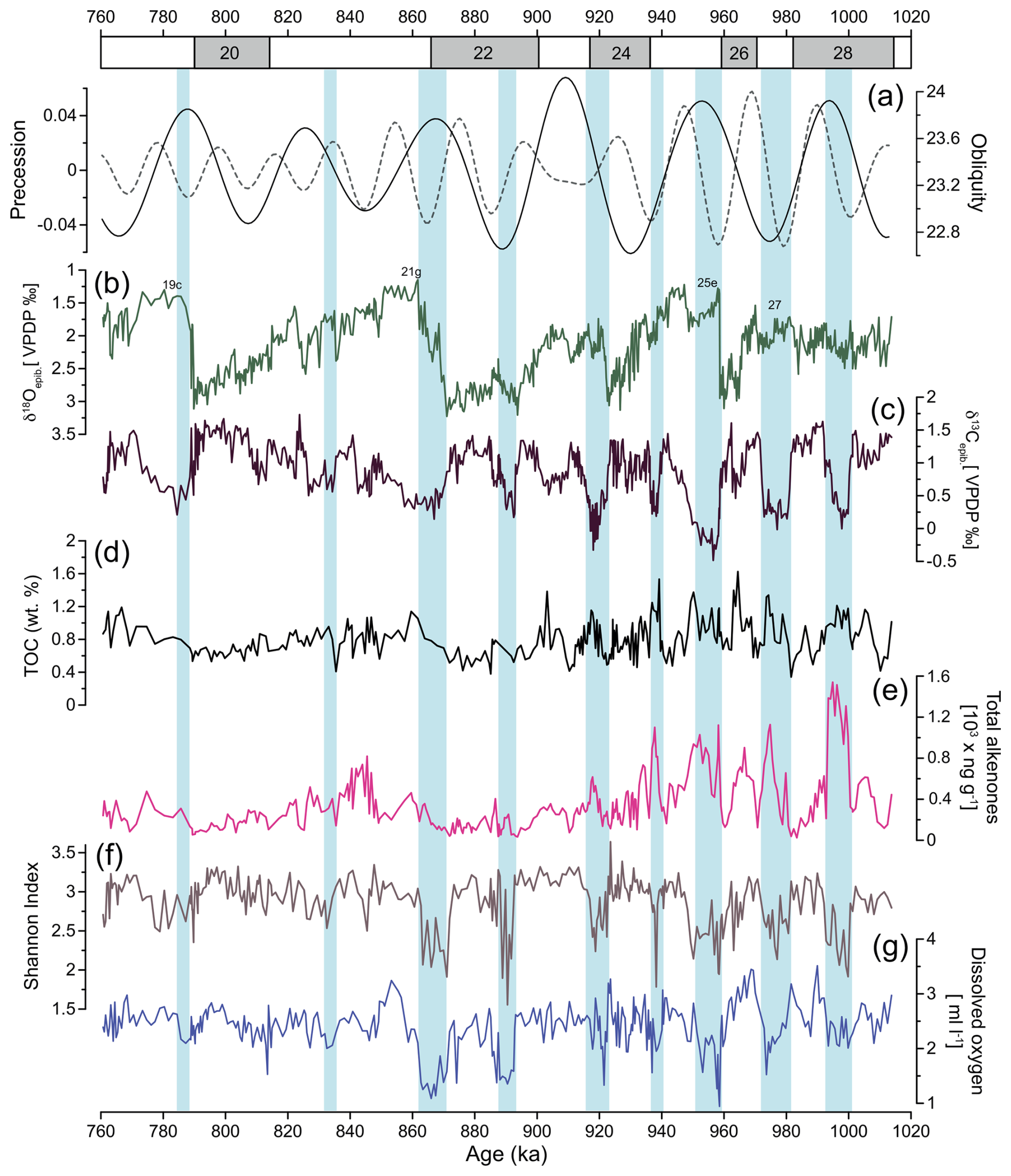Figure 4(a) Precession and obliquity (Laskar et al., 2004). IODP Site U1387 records of (b) epibenthic δ18O record, (c) epibenthic δ13C record, (d) total organic carbon (TOC) showing enhanced organic matter input during period of increased productivity, (e) total alkenone concentrations indicating coccolithophorid productivity, (f) Shannon diversity index, and (g) estimated dissolved oxygen using species microhabitat preferences. Light-blue bars indicate intervals of low-oxygen conditions at IODP Site U1387.