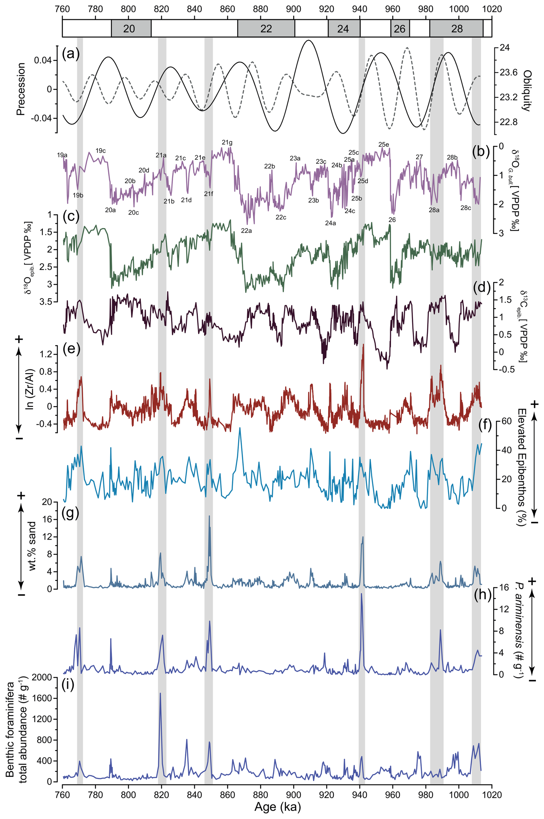 Similarly to the trends in the epibenthic δ13C data, the ln (Zr/Al) record shows higher values during glacial lower-sea-level-stand periods and lower values during interglacial higher sea level stands (Fig. 5e). Additionally, higher Zr/Al values are associated with several stadials (e.g. MIS 28c, MIS 24c, MIS 24a, MIS 22a, MIS 22c, MIS 20a), indicating episodes of intensified bottom current activity. Millennial-scale variations are also observed in the wt % sand (> 63 µm) record. The highest values occurred during stadial sub-stages MIS 25d and MIS 21f, with peaks of 16 % and 12 %, respectively. Additional wt % sand (> 63 µm) maxima were recorded during the stadial sub-stages MIS 28a, MIS 23b, MIS 21a, and MIS 19b (Fig. 5g).