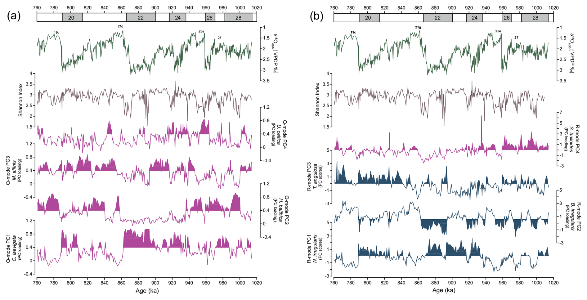 The Q-mode PCA revealed four dominant assemblages (Fig. 6a). PC1 is dominated by C. laevigata, a species associated with environments with high food availability (Mackensen et al., 1995) and where oxygen levels remain sufficiently high (Gussone and Filipsson, 2010). It is part of a fauna that seems to be restricted to glacial time periods (e.g. MIS 24, MIS 22, and MIS 20).