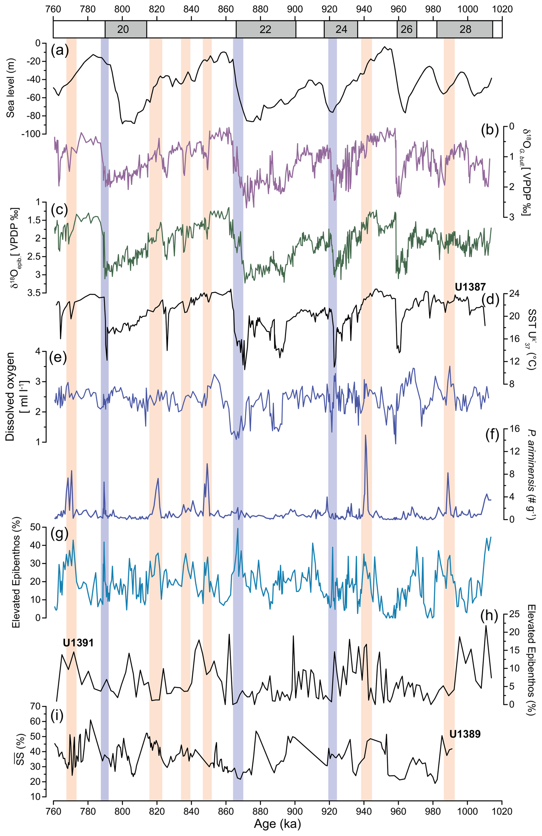 The percentages of the elevated epibenthos group (Fig. 5f) show significant variability within each MIS, with maximum values reaching nearly 55.5 % during MIS 22 and minimum values of 0 % during MIS 25. Consistently high values are observed during colder climate periods. As expected, P. ariminensis (Fig. 5h) shows abrupt increases in total abundance (above eight specimens per gram) during the stadial sub-stages MIS 28a, MIS 25d, MIS 21f, and MIS 21b but also during the interstadial sub-stage MIS 21a. Notably, all of these abrupt increases coincide with peaks in the wt % sand (> 63 µm) (Fig. 5g). Most of the P. ariminensis total abundance maxima coincide with total benthic foraminifera abundance (Fig. 5i). Dissolved oxygen levels (Fig. 4g) showed substantial variability over time and ranged from 0.9 to 3.5 mL L−1. High values were reconstructed for MIS 28a, MIS 26, MIS 24, MIS 23b-a, and MIS 22b, with relatively stable concentrations above 2 mL L−1 for MIS 21 to MIS 19. MIS 28b, MIS 27, MIS 25e, MIS 25c, MIS 23c, and MIS 22c-a exhibited low values around 1 mL L−1.