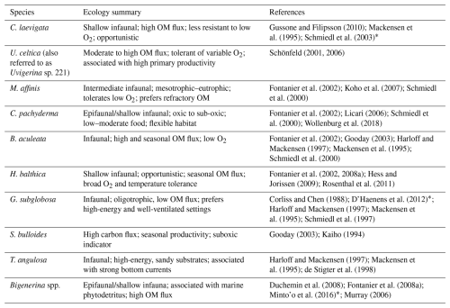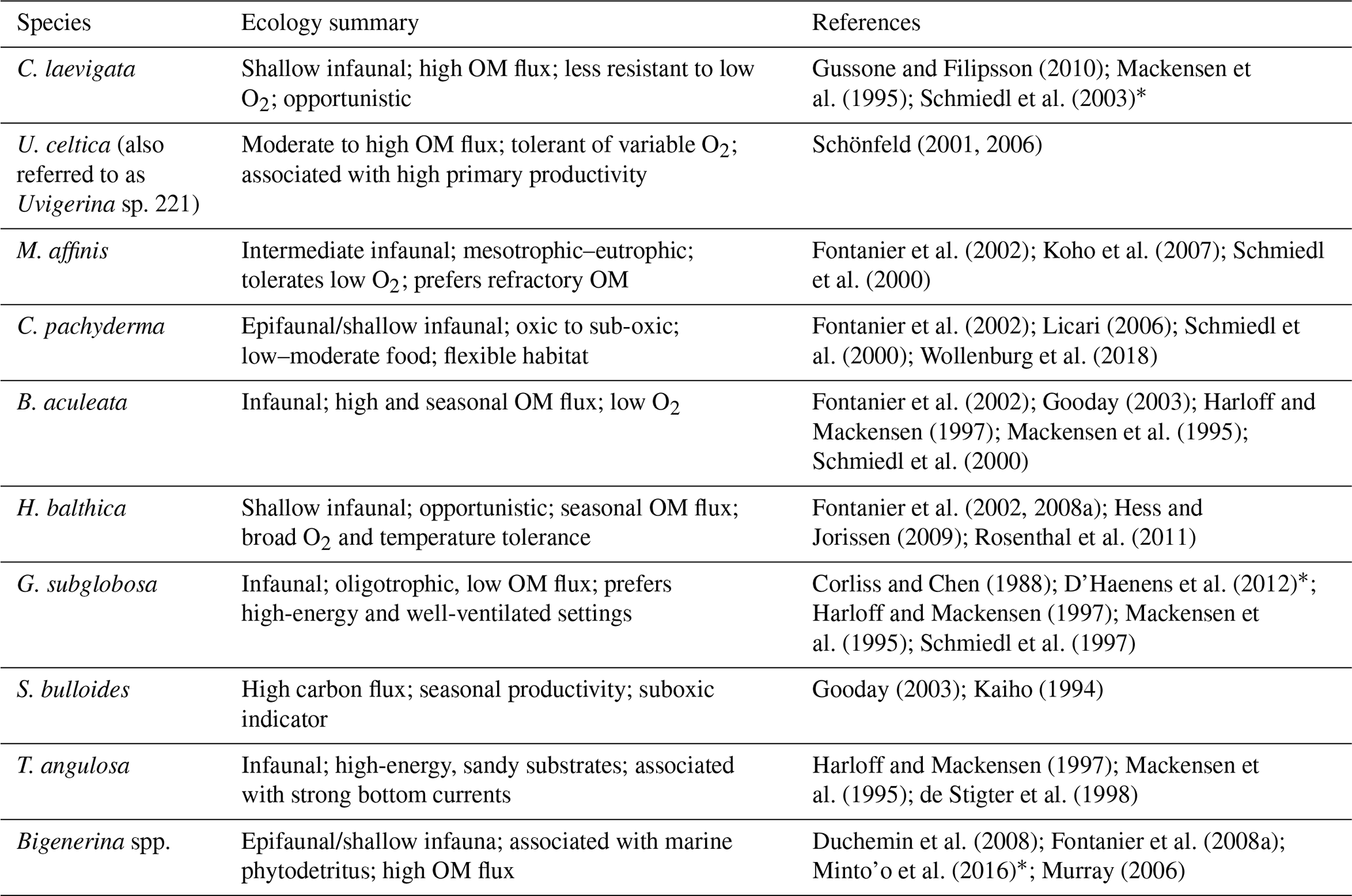 Table 1Microhabitat and ecological preferences for the 10 most abundant benthic foraminifera species and the corresponding bibliographic references. (OM denotes organic matter). References with * mark fossil-based studies.