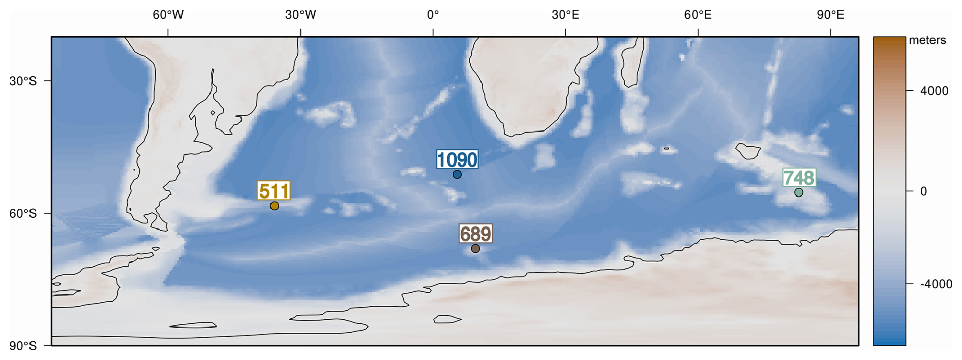 We targeted two sub-Antarctic sites, DSDP 511 (Falkland Plateau) and ODP 1090B (Agulhas Ridge), because they retain continuous diatom record across the Eocene–early Oligocene and record large shifts in biogenic opal that track the development of Southern Ocean (SO) fronts and the emerging ACC (Anderson and Delaney, 2005; Plancq et al., 2014; Renaudie, 2016; see Fig. 1). To contrast these archives, we also focused on ODP sites 689D (Maud Rise) and 748B (Kerguelen Plateau), which are closer to the Antarctic continent and show low diatom abundance throughout most of the late Eocene. However, both record a pronounced shift in biogenic opal deposition near the E–O (e.g., Diester-Haass and Zahn, 1996; Salamy and Zachos, 1999; Fig. 1). These Antarctic-proximal sites allow us to explore how glacial and oceanographic reorganizations near the continent influenced diatom communities. Taken together, the four sites span key latitudinal and environmental gradients, enabling comparison of regional diatom responses to EOT climate change.