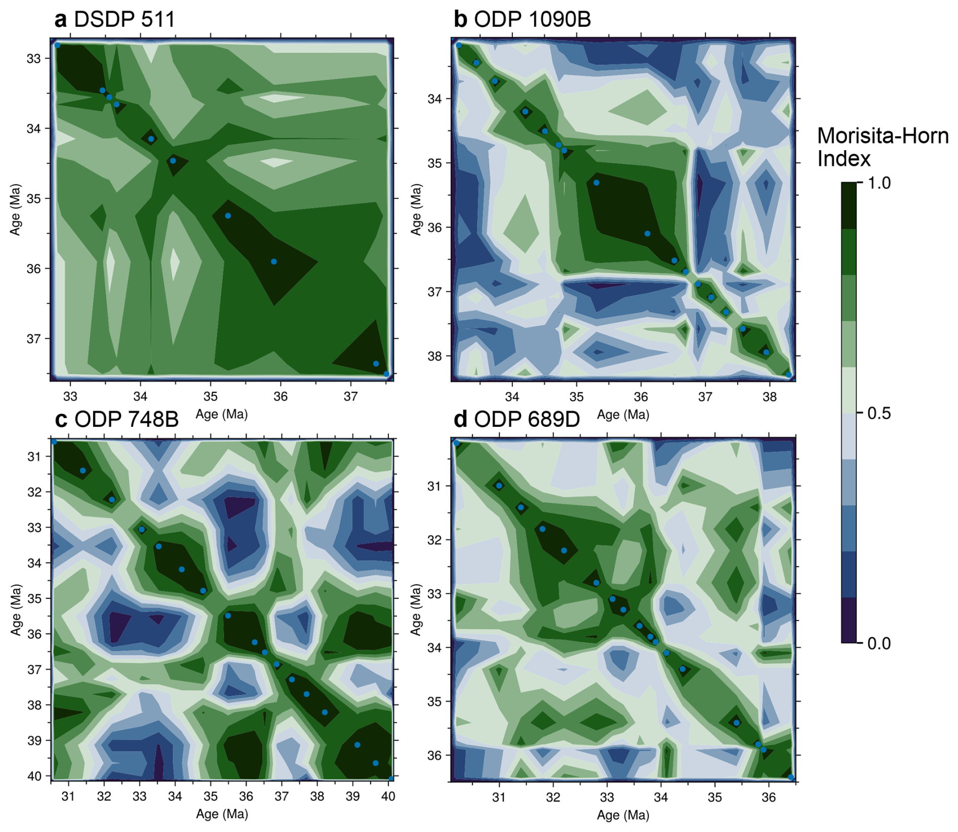Figure 7Temporal self-similarity of diatom assemblages at four SO sites. Contour plots give pairwise Morisita–Horn similarity values for all sample combinations at each site. In each panel, both axes are sample age (Ma), points on the main diagonal are therefore comparing a sample with itself (similarity = 1) The color code for similarity values ranges from dark-green (high similarity, nearly identical communities) through to dark-blue (low similarity, distinct communities), as indicated by the scale bar common to all panels. Blue dots mark the positions of the analyzed samples, and the surrounding contours are interpolated between these empirical points. Continuous green zones therefore denote intervals of higher similarity, while abrupt color changes highlight rapid compositional shifts; for example, ODP 1090B exhibits a relatively stable interval between about 37 and 34.5 Ma, bounded by sharp transitions. Pairwise Morisita–Horn similarity values for each site are provided in Supplement S3.