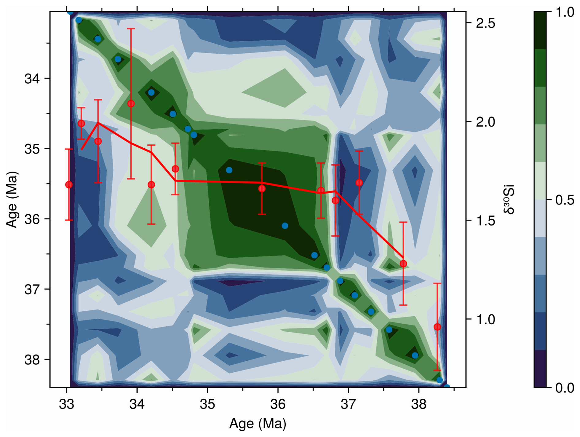 Figure 8Morisita–Horn community similarity contour plot for ODP site 1090 with diatom-based silicon isotope values (δ30Si; Egan et al., 2013) overlaid. See Fig. 7 for guidance on reading the similarity contour and scale bar (right; 1 = identical community composition, 0 = no similarity). Red points show individual δ30Si measurements with 2 SD error bars, and the solid red line represents a three-point running average trend. Note how the δ30Si trend curve bends through intervals changing community composition, like light refracting through media of differing densities. Both the δ30Si record and the diatom assemblage data underlying the similarity contours are based on the >10µm diatom size fraction.