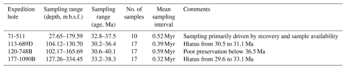 Qualitative preservation assessments were conducted for all samples, accounting for preserved fine morphological features, intact valves, and the absence of dissolution relicts. Each sample was classified into one of three categories: poor, fair, or good (see Fig. S1 in the Supplement for individual assessments). We note that site 511 is the only site in our study not primarily recovered with modern drilling methods (drill string heave compensator, hydraulic piston core, and/or XPC), and the initial core descriptions show the typical disturbance of fine-scale sediment structure by heave-uncompensated rotary drilling. However, at the between-core resolution of our sampling, we have not noted any drilling-related distortion of the stratigraphic record. The stratigraphic integrity of the studied interval has also been documented in prior detailed biostratigraphic studies of this site (e.g., Gombos and Ciesielski, 1983). Table 1 provides an overview of the sampled intervals, age ranges, and key site-specific details, while stratigraphic sections and sampled horizons for each site are shown in Fig. S1.