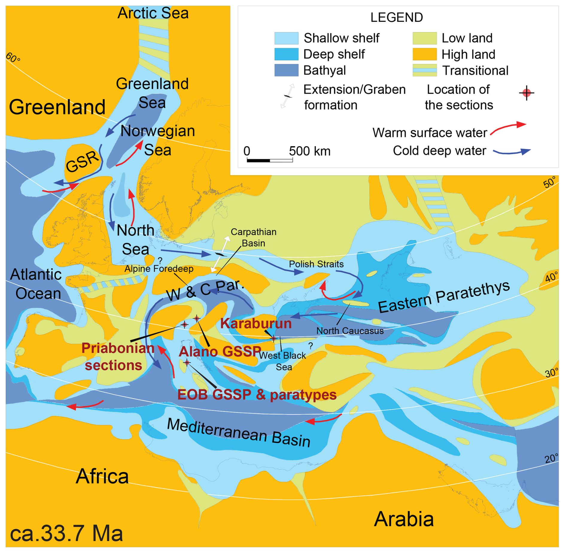 Figure 1Map displaying the paleogeographic setting of the Alano section during Eocene–Oligocene boundary times (ca. 33.7 Ma). This figure serves specifically to address the context in the light of other Bartonian–Priabonian marine palynological reference sections. It illustrates a boreal-water influx in a dominant anti-estuarine circulation the Paratethys, extending into the Mediterranean Tethys. GSR: Greenland Scotland Ridge. W&C Par.: western and central Paratethys. The phrase “EOB GSSP and paratypes” refers to the Eocene–Oligocene boundary GSSP at Massignano and its paratypes. Adapted from Brinkhuis et al. (2025).