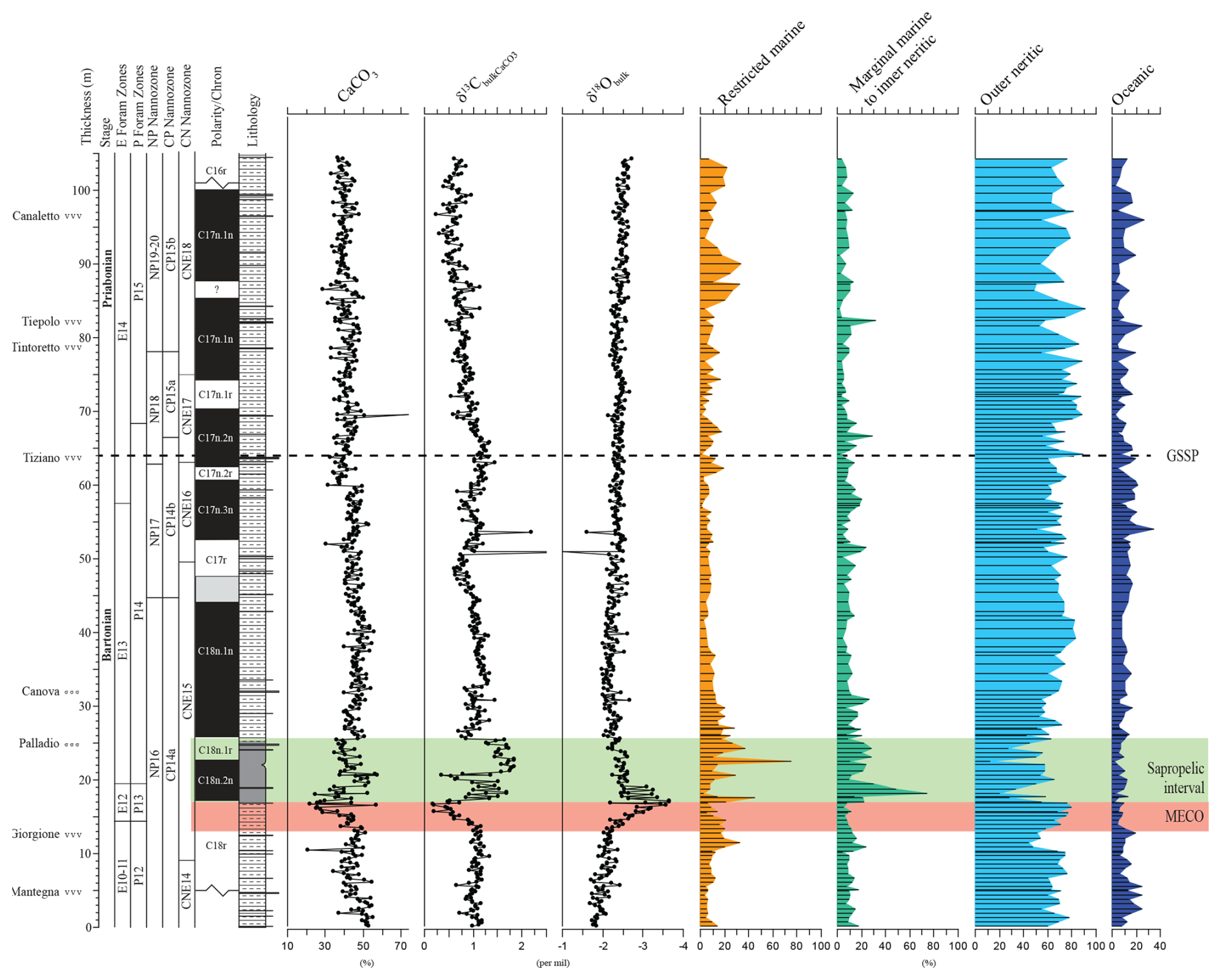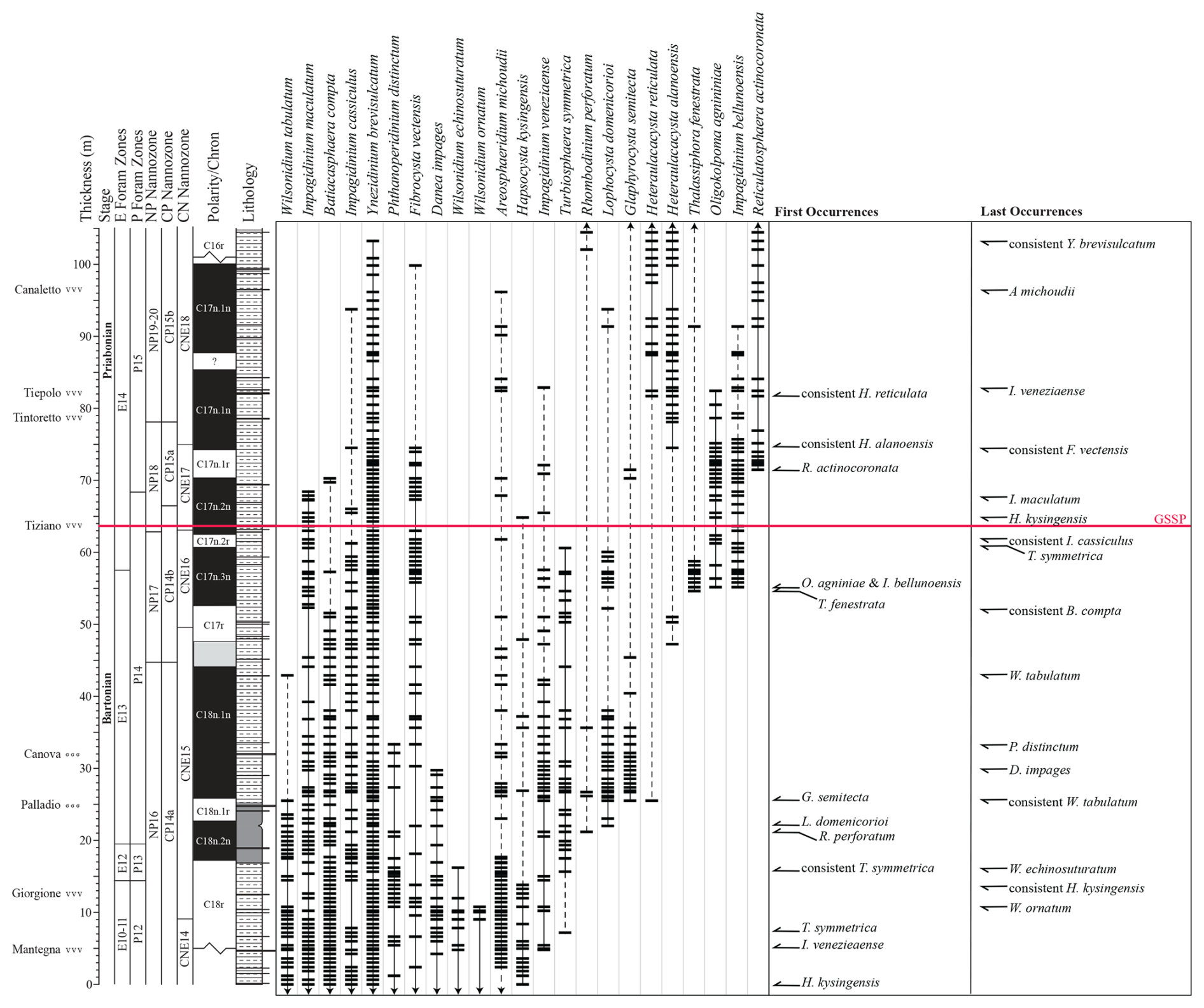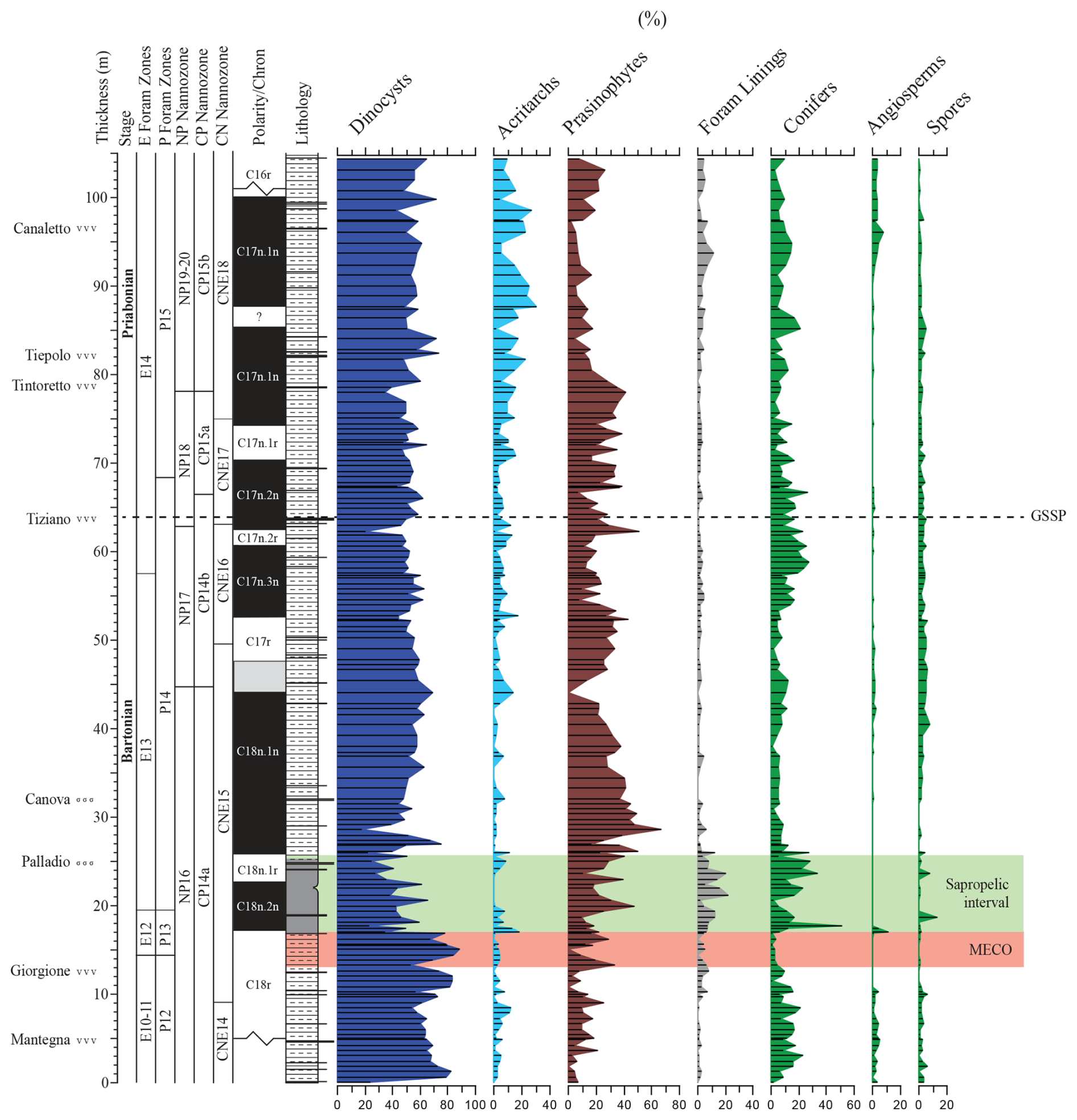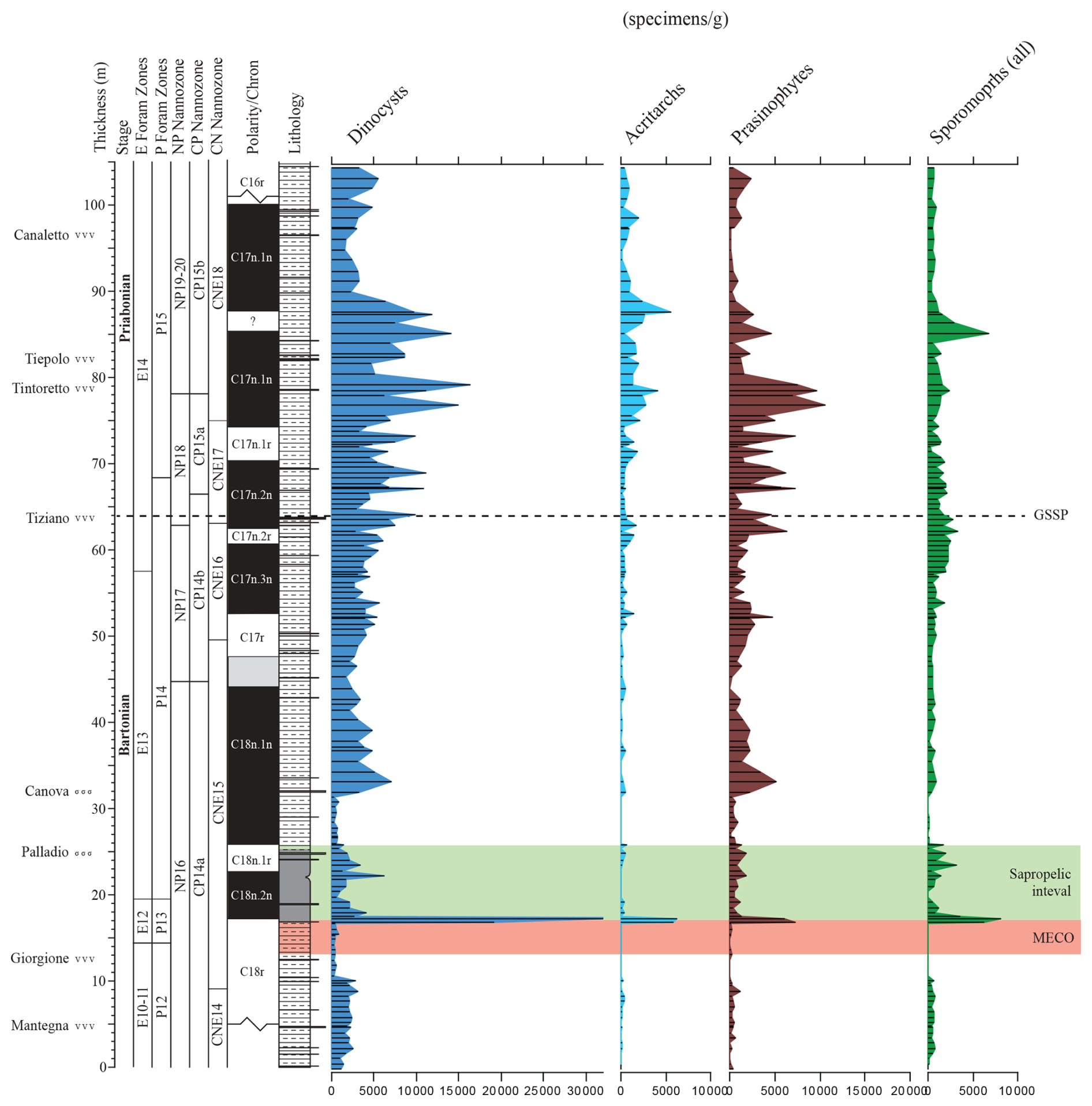 Only quite recently did the International Committee on Stratigraphy (ICS) formalize and officially ratify the hemipelagic Alano di Piave section in NE Italy as the location of the Bartonian–Priabonian stage Global Boundary Stratotype Section and Point (GSSP, Agnini et al., 2011, 2014, 2021, Fig. 1). The boundary is placed at a level of 63.57 m and coincides with the base of a prominent crystal tuff layer, known as the Tiziano bed. Astronomical tuning and radio-isotopic techniques yielded absolute ages of 37.710 and 37.762 Ma, respectively, for the GSSP horizon (Galeotti et al., 2019). Among foraminifera, important associated biostratigraphic events include the successive extinctions of large acarininids and Morozovelloides crassatus. The GSSP is also characterized by the appearance of common Cribrocentrum erbae and the range top of the Chiasmolithus grandis (both coccolithophorids). Recent marine palynological studies show that, in terms of organic walled dinoflagellate cysts or “dinocysts”, the first occurrence (FO) of Oligokolpoma agniniae (∼ 8 m below the GSSP boundary) and the FO of Reticulatosphaera actinocoronata (∼ 8 m above the GSSP boundary) may be taken as additional biostratigraphic indicators of the Bartonian–Priabonian boundary (Fig. 2; Iakovleva, 2025). Furthermore, the GSSP is calibrated against Chron C17n.2n. For more information, including, e.g., location details and lithostratigraphic descriptions, the reader is referred to Agnini et al. (2021).