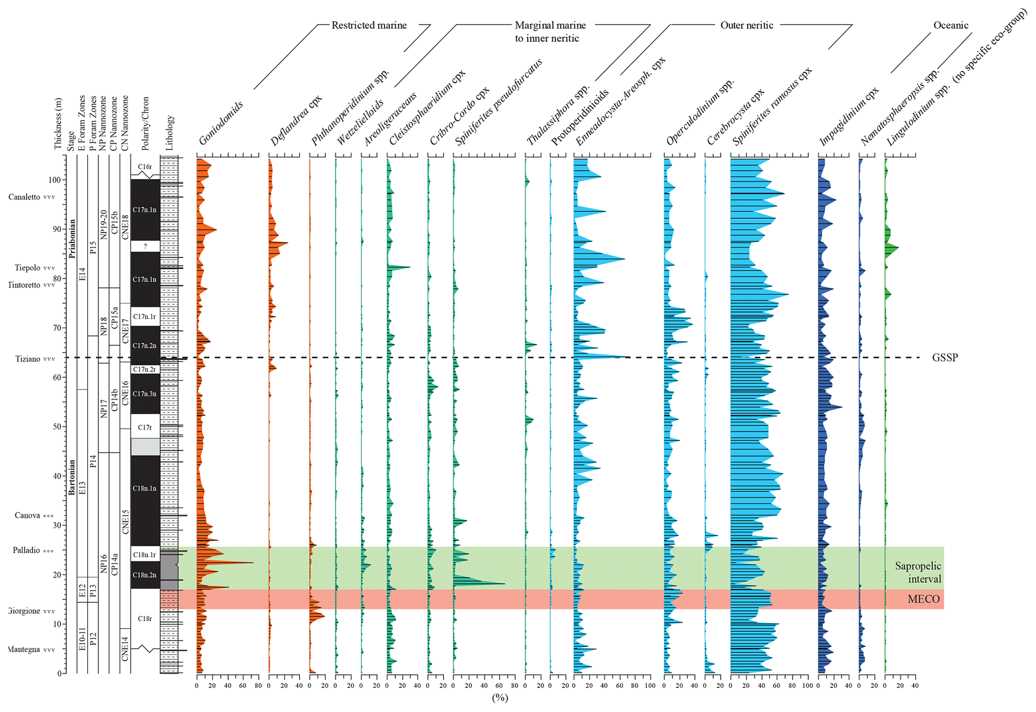 A first observation is that in neither of the discussed groups or categories is an evident shift, change, or biotic reorganization recorded in association with the GSSP level. Overall, with the exception of the MECO and its aftermath, associations and assemblages are remarkably stable. The persistent presence of oceanic dinocyst groups (Fig. 6) indicates continuous deposition in a distal, continuously open marine, hemipelagic setting. The introduction of more proximal marine dinocysts and sporomorphs is thought to be caused by transport from adjacent, relatively nearby shallow-water platforms, e.g., from the Lessini Shelf (Priabonian-type area). The spectral analysis results show that transport from proximal settings is – on the investigated temporal scale – modulated by long-eccentricity cyclicity. Through modulating precession and, therefore, monsoonal intensity, a link with rhythmic changes in run-off can be envisaged, and changes in eustatic sea level are not necessarily involved.