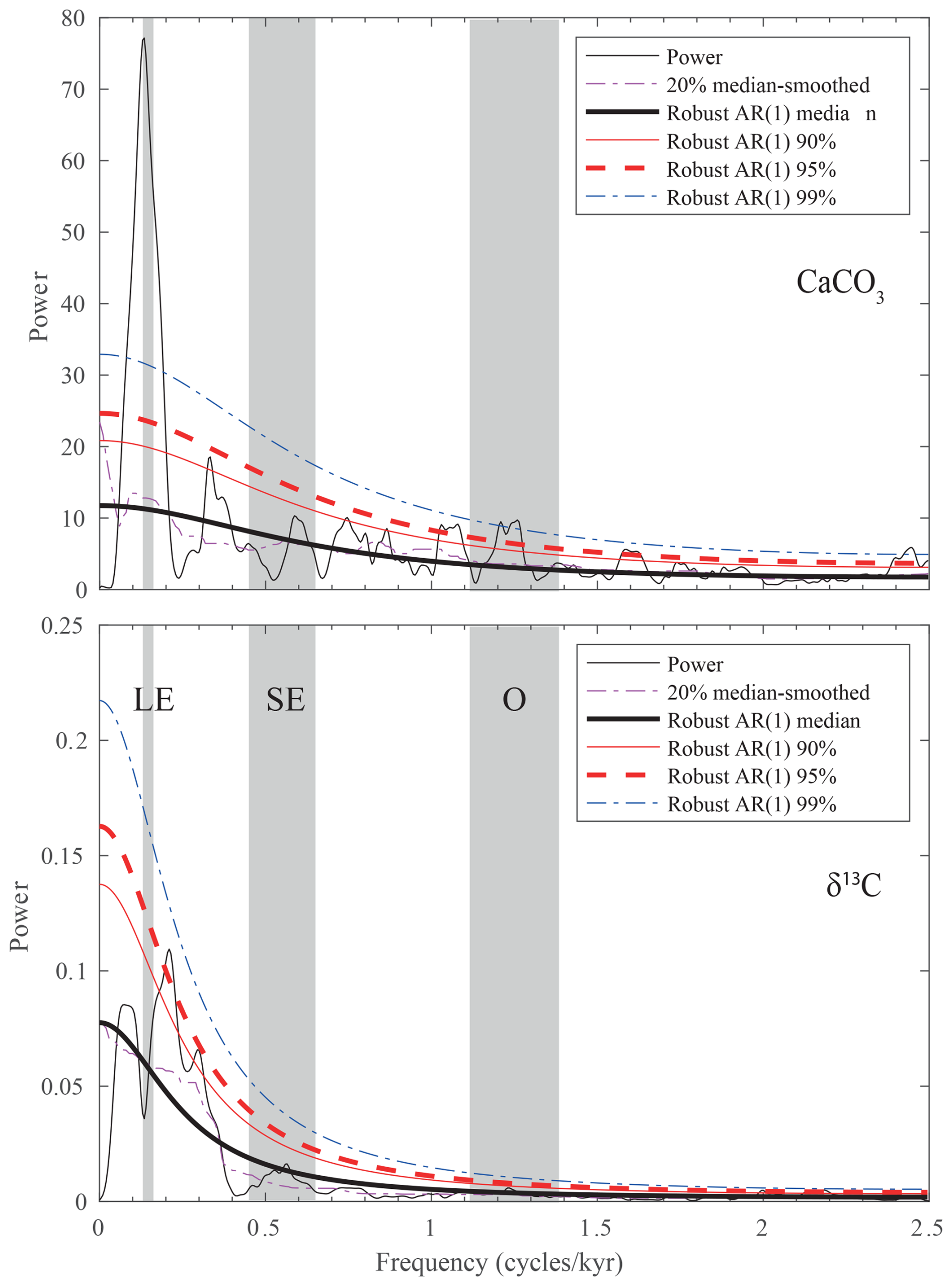 Figure 7MTM spectra of the wt % CaCO3 and δ13C records from the lower segment of the Alano di Piave succession, carried out in the time domain. Vertical bands represent the expected frequency of long eccentricity (LE), short eccentricity (SE), and obliquity (O) based on sedimentation rate.
