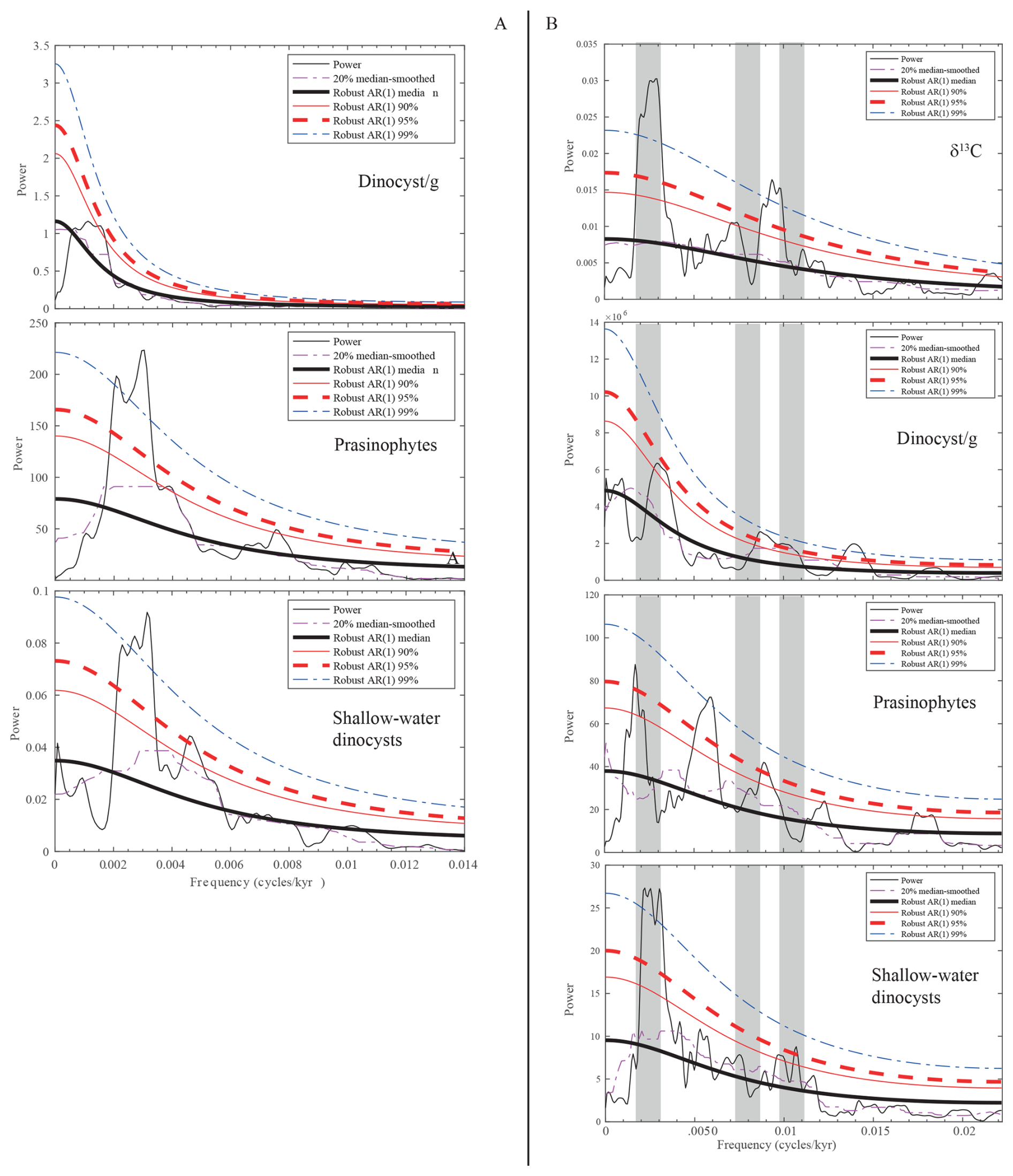 We use the filter of the 405 kyr component of the wt % CaCO3 to transfer the records of selected palynological parameters, including the number of dinocysts per gram of sediment and the relative abundance of prasinophytes and marginal marine dinocysts, into the time domain. No significant components referable to astronomical forcing are present in the MTM spectrum of the dinocyst per gram record (Fig. 8a). However, the MTM analysis of the relative abundance of prasinophytes and marginal marine dinocysts reveals high spectral density in the frequency range of the 405 kyr eccentricity, indicating a strong control of astronomical forcing on these two parameters.