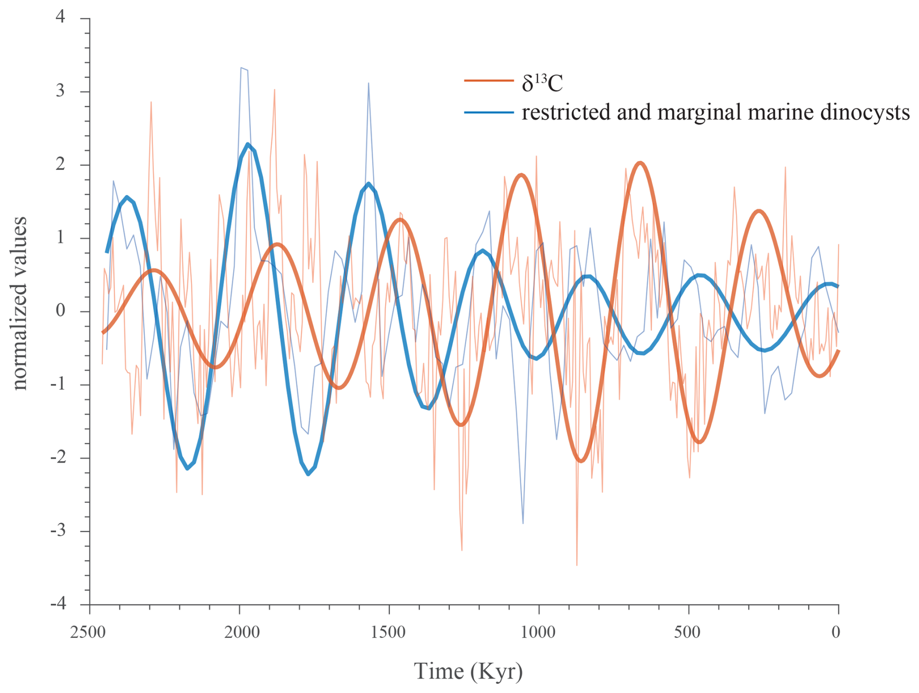 Figure 9The 405 kyr component filtered from the ∂13C record (orange) and the summated proportions of restricted and marginal (shallow) marine dinocysts (blue), plotted against the normalized and detrended records.