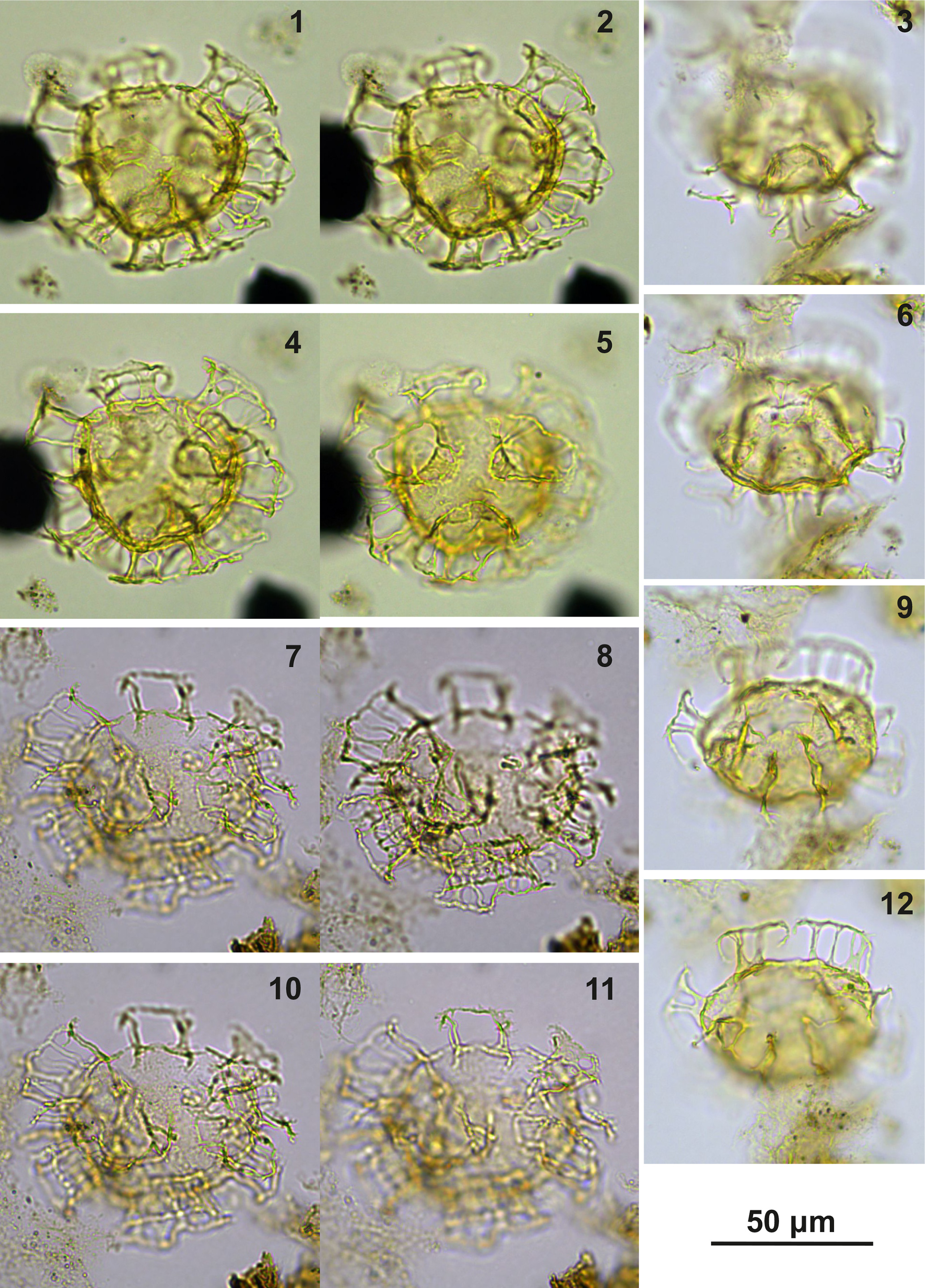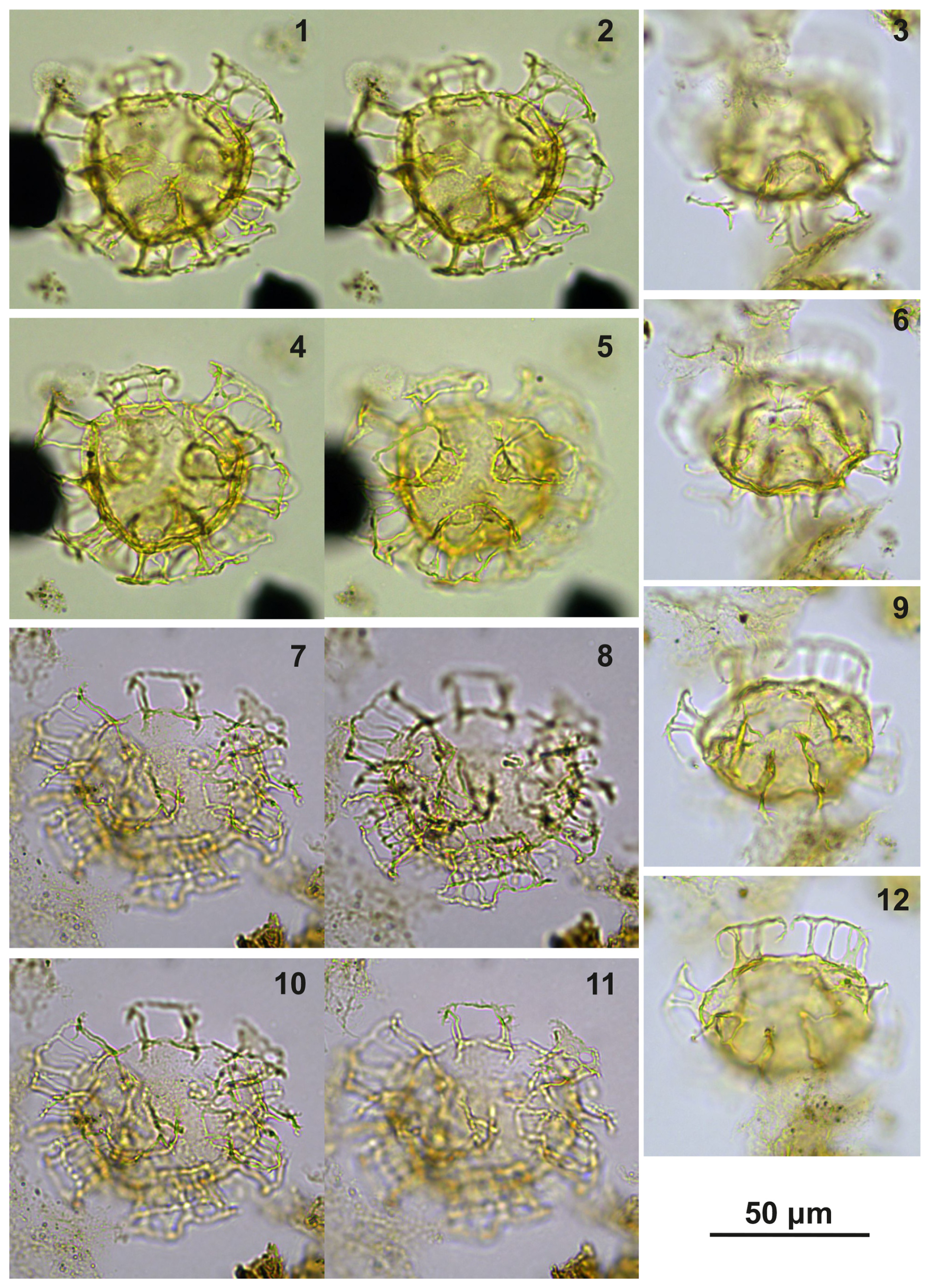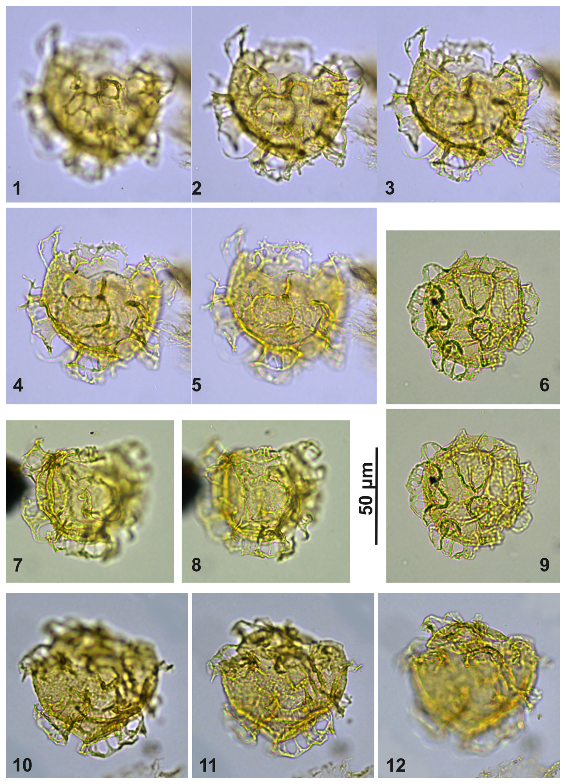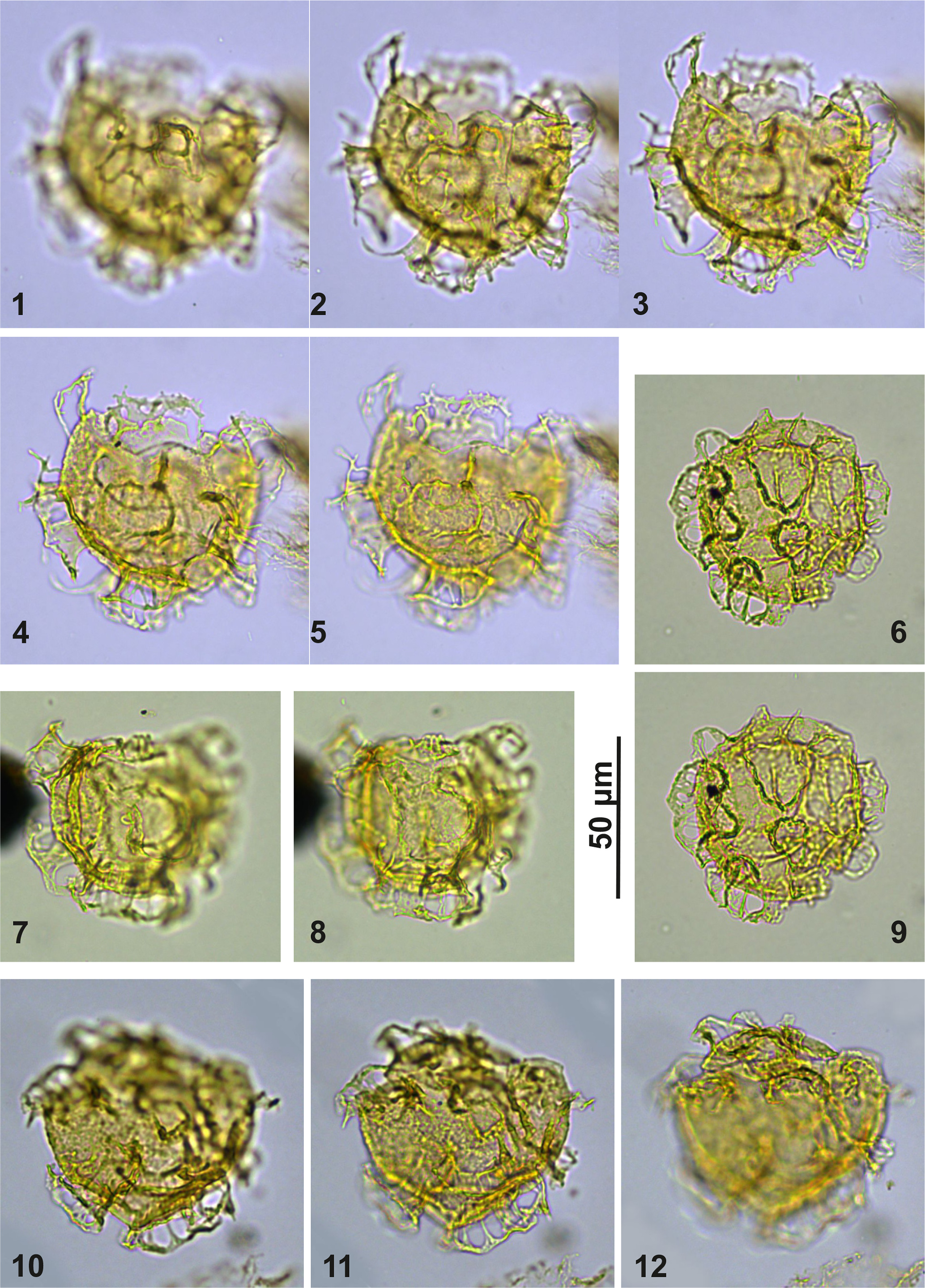 Comparison. Bujakidinium umbellum has affinities with Polysphaeridium congregatum but clearly differs in having much thinner and longer processes and in that they are distally connected by a perforate membrane (ectophragm).