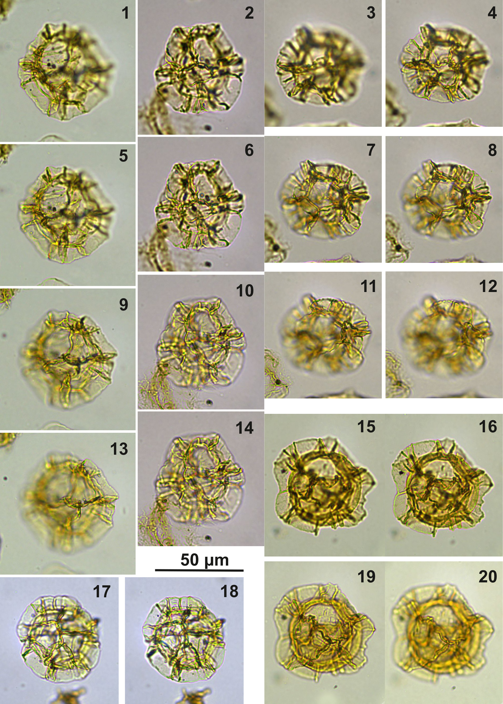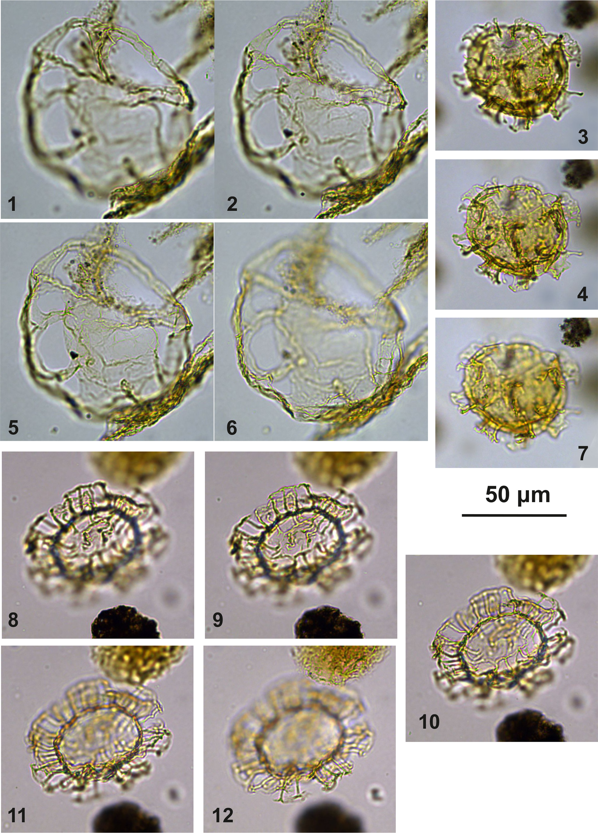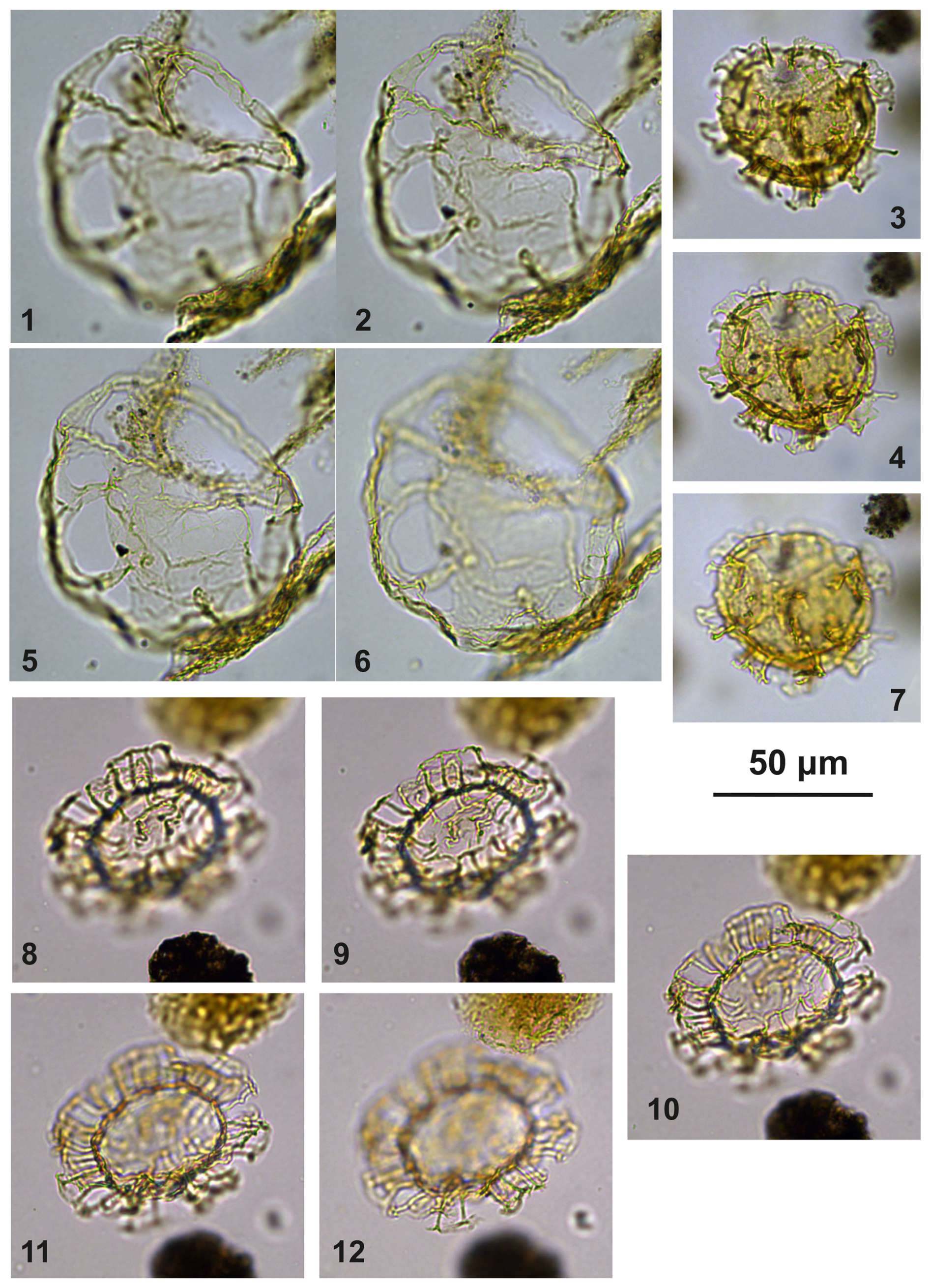 Comparison. Bujakidinium umbellum has affinities with Polysphaeridium congregatum but clearly differs in having much thinner and longer processes and in that they are distally connected by a perforate membrane (ectophragm).