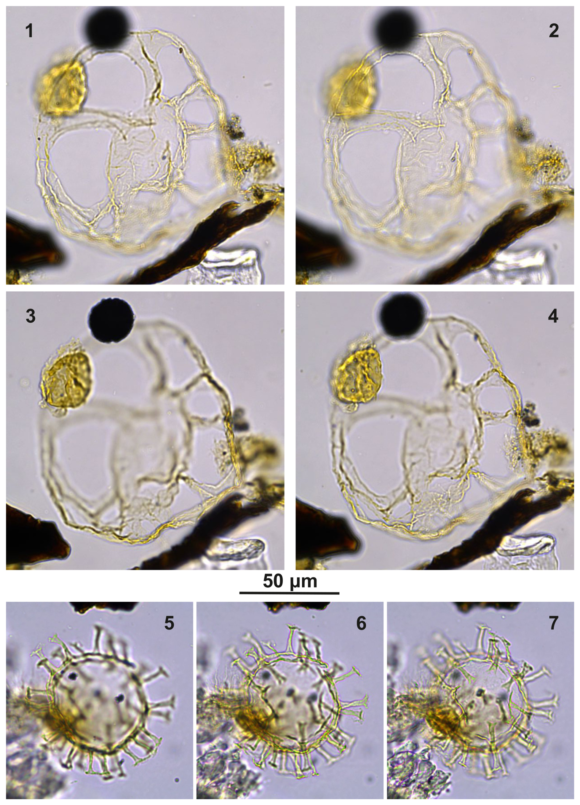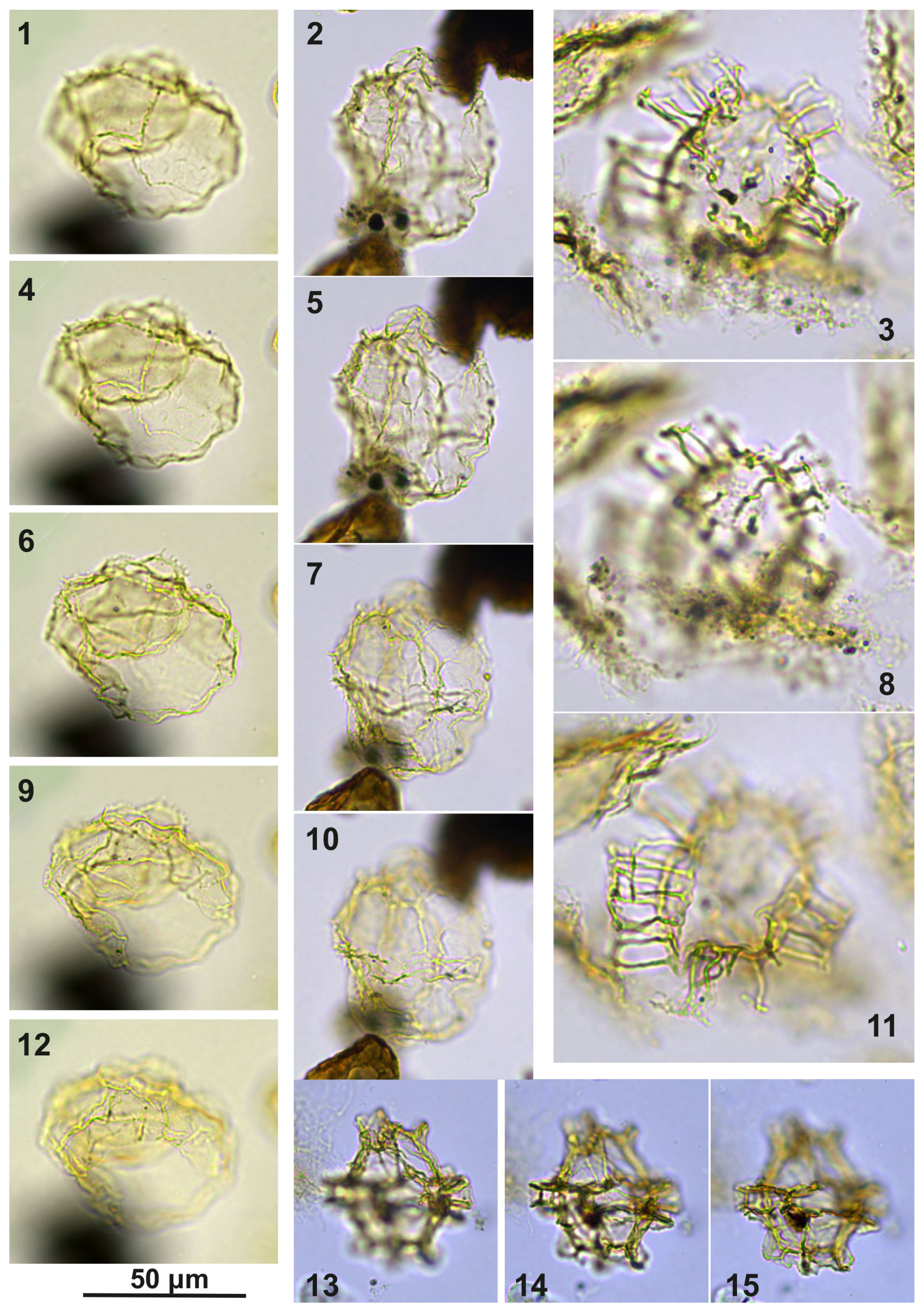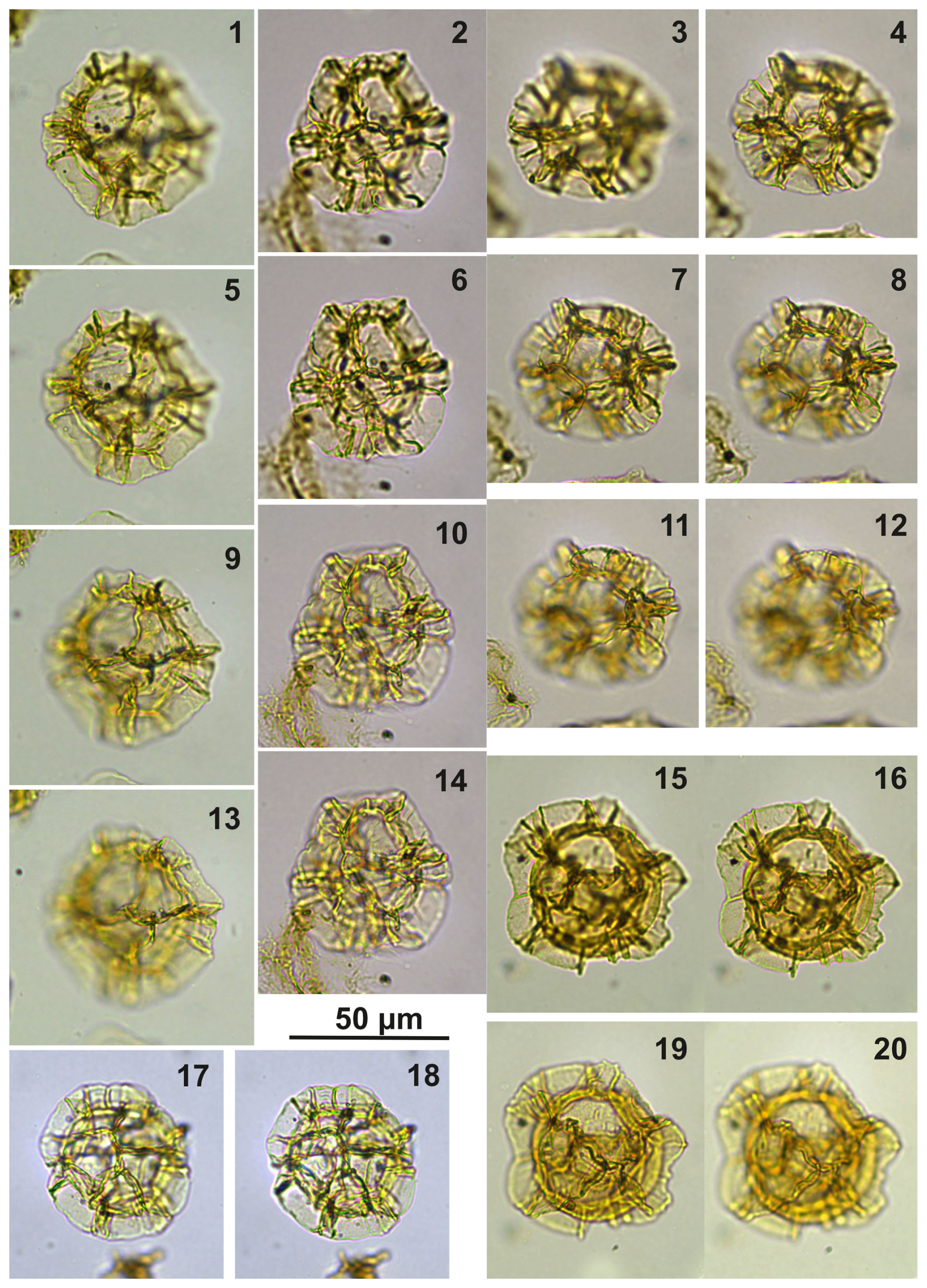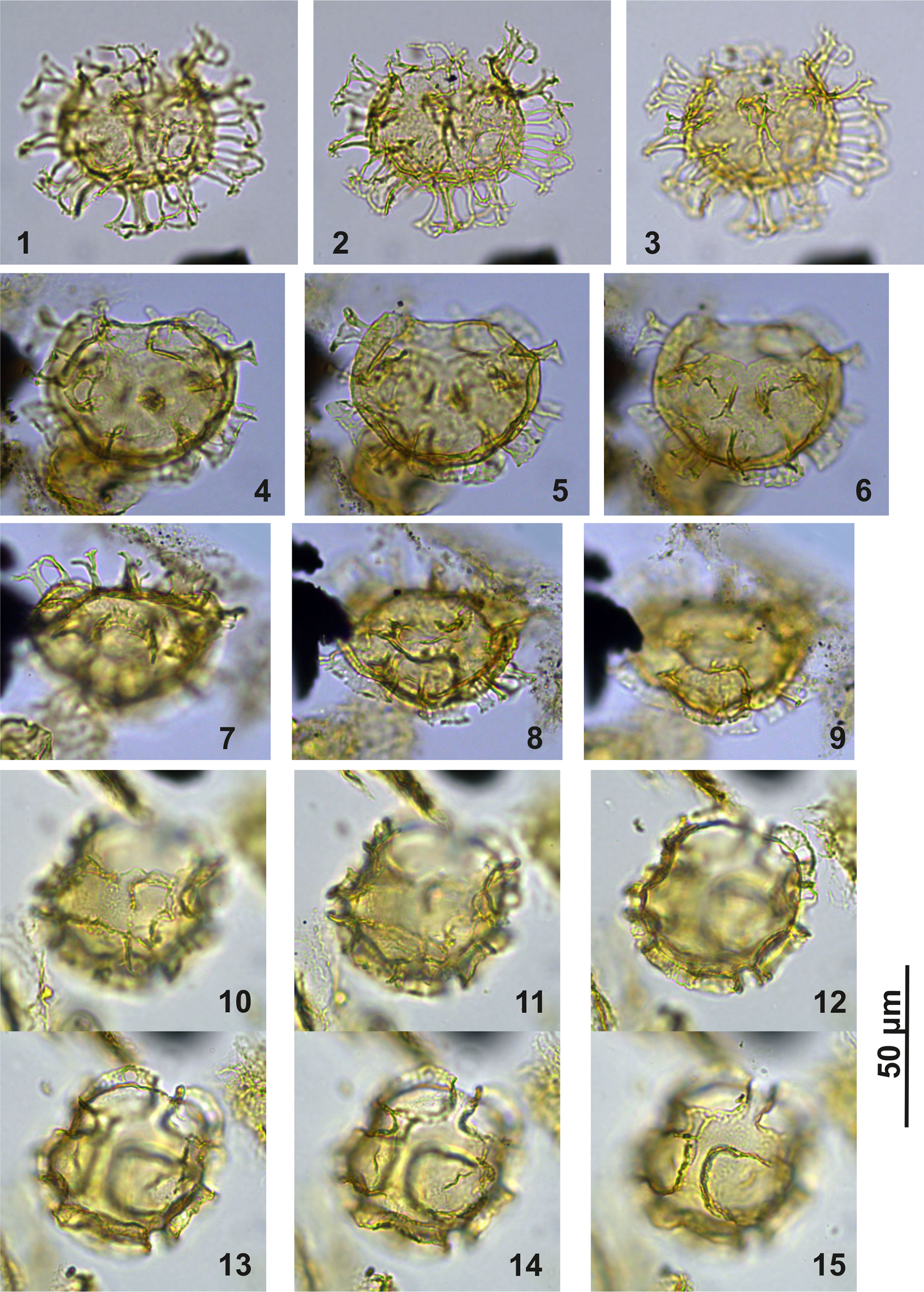 Comparison. Bujakidinium umbellum has affinities with Polysphaeridium congregatum but clearly differs in having much thinner and longer processes and in that they are distally connected by a perforate membrane (ectophragm).