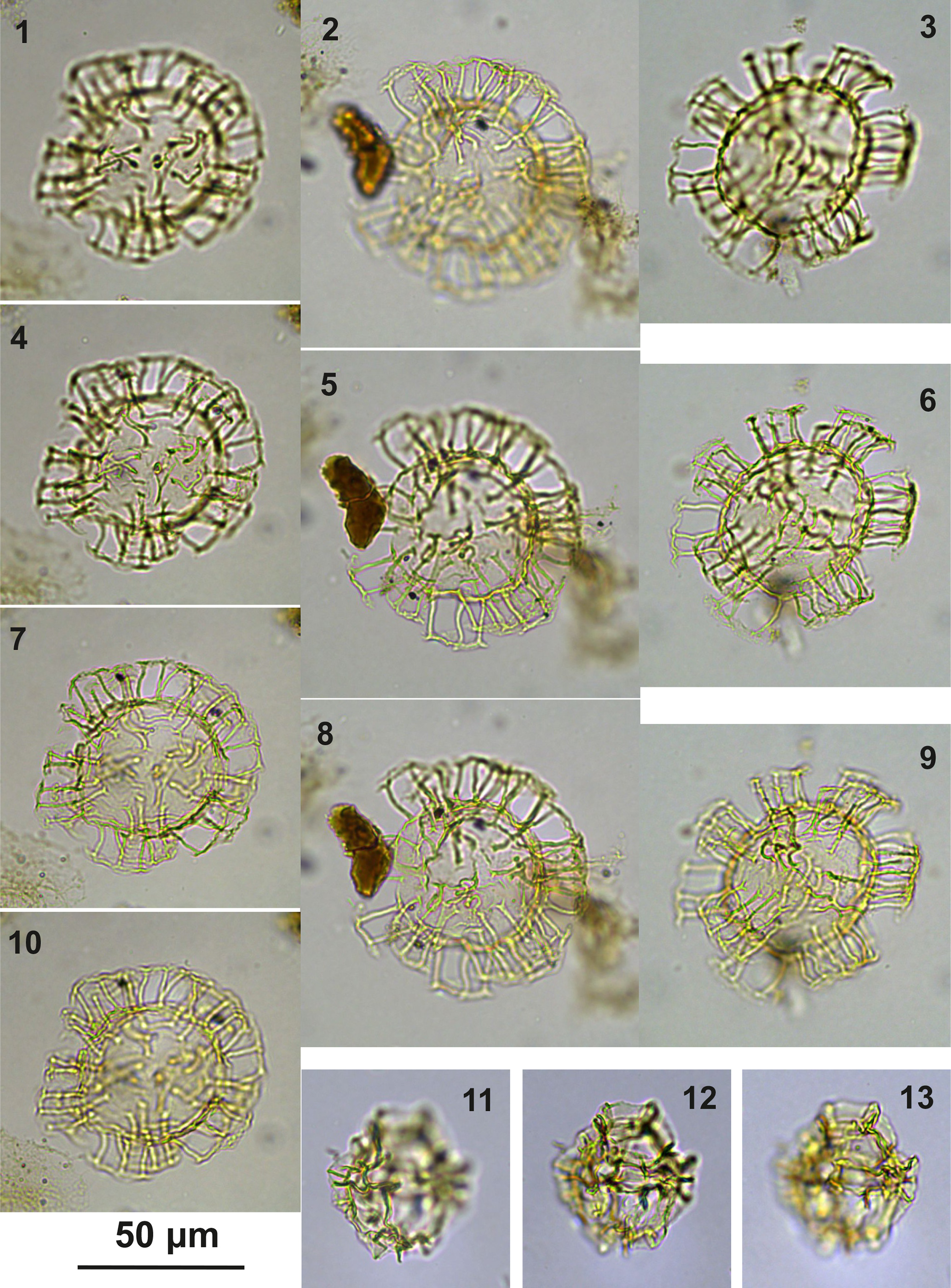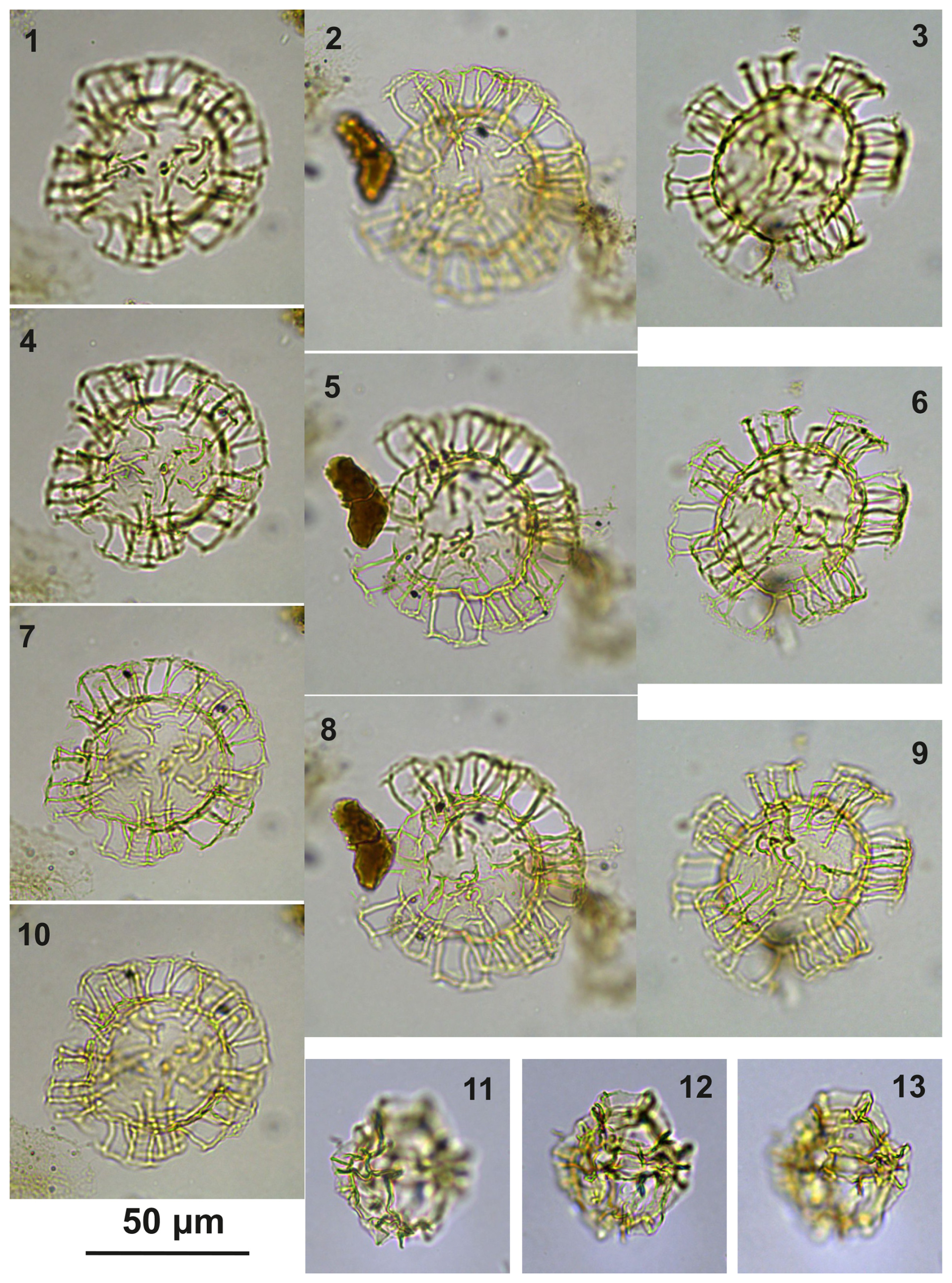 Wall relationships: a smooth to scabrate endophragm and (appressed) periphragm, with the latter giving rise to numerous short hollow processes, distally connected by a thin, often perforated ectophragm.