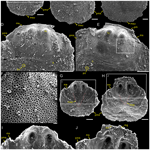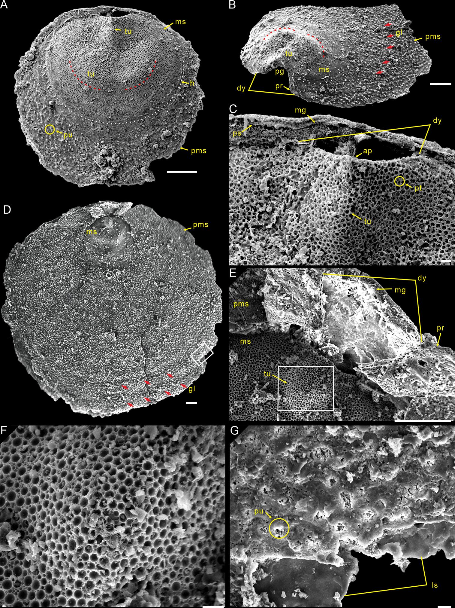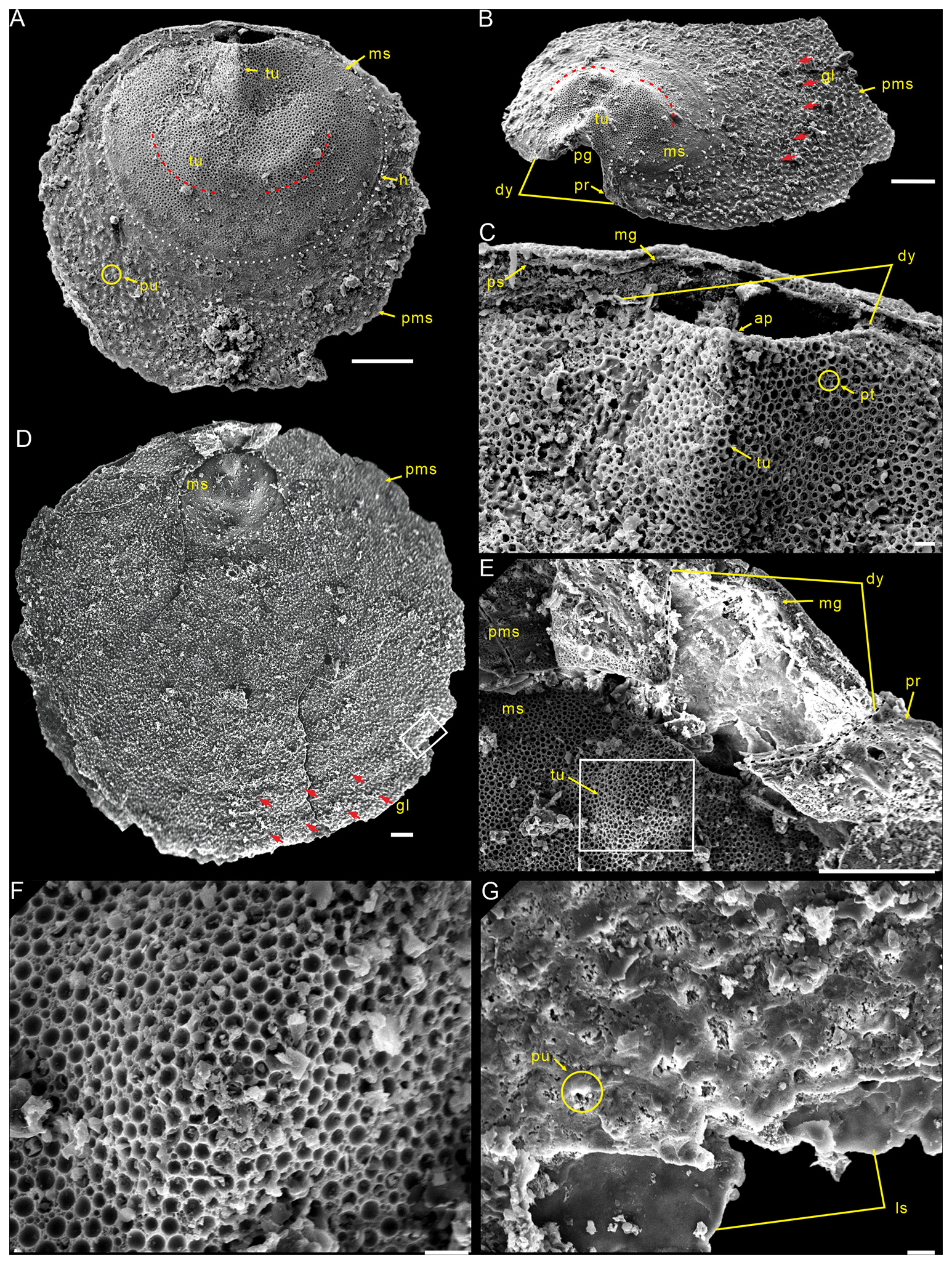 Description. Shell is small and circular or closely circular in outline, with maximum width near the mid-length (Figs. 2A–C, G, H; 4A, D; 5A, B, D). Both valves typically fragmented at anterior and lateral margins (Figs. 2–5). Metamorphic shell is close to circular in outline (Figs. 2A–C and 5A, D), covered by circular pits of varying diameters (Figs. 2F; 3E; 4C, F). Two types of pitting ornaments are observed on the metamorphic shell: small pits with diameters ranging from 0.5 to 3 µm, and large pits with diameters ranging from 3 to 7 µm (Figs. 2F, 3E, 4F). Two tubercles are on the dorsal metamorphic shell (Figs. 2A–E, 3A–D), whereas the ventral metamorphic shell shows a single high tubercle to the posterior (Fig. 4A–E) and two low tubercles to the anterior (dotted red line, Fig. 4A, B, D). The metamorphic shell is separated from the post-metamorphic shell by a halo, which is poorly developed on small specimens (Figs. 2A–E and 4A) but obviously developed on larger specimens (Figs. 3A–D and 4D). Post-metamorphic shell covered by numerous irregular pustules (∼ 7 µm in diameter on average; Figs. 2A–E; 3A–D; 4A, B, D, G), and well-developed growth lines seen in better-preserved, larger specimens (red arrows, Figs. 3A–C and 4B, D). Moreover, two shell layers are observed in the cross-section of the anterior edge of the post-metamorphic shell, namely the compact lamina of the primary layer and the columnar structures of the secondary layer (Fig. 3H), while pustules developed on the surface of the primary layer (Fig. 4G).