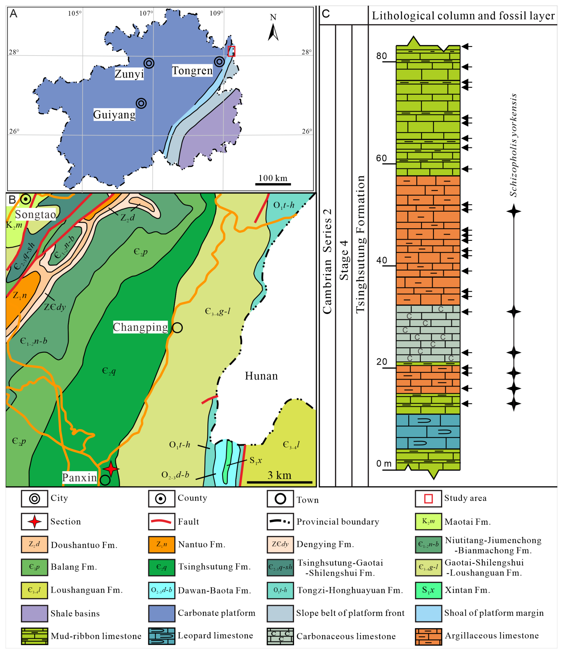 Figure 1Lithofacies palaeogeographical, geological, and geographical maps showing the studied area, section, and lithological column and fossil layer. (A) Lithofacies palaeogeographical map of Guizhou Province (modified from Sang and Wang, 1987; Yin, 1990). (B) Geological and geographical maps of the study region (the four-pointed red star refers to the studied section). (C) Lithological column and fossil layer of Schizopholis from the Tsinghsutung Formation of Cambrian Series 2, Stage 4 at the Panxin section in Songtao County, Guizhou Province (the black arrows indicate sample layers, and the four-pointed black stars indicate fossil layers).
