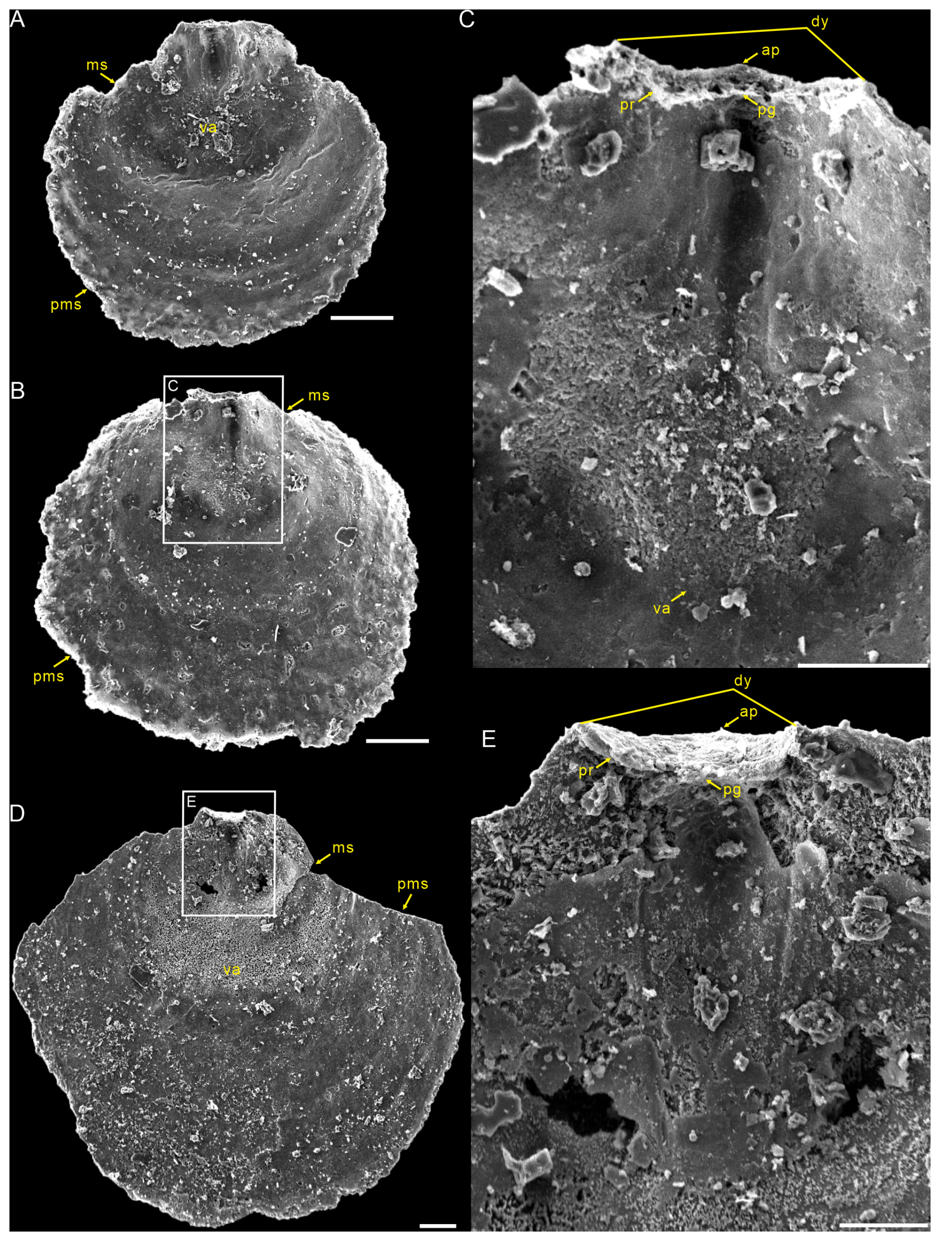 Ventral valve is small, circular in outline, with maximum width near mid-length (Figs. 4A, D and 5A, B, D) and approximate ratio of average width to length of 1.14 (length 549 to 1856 µm and width 632 to 1918 µm, Table 2). Ventral metamorphic shell is rounded in outline (dotted white line, Fig. 4A, B, D), with an approximate ratio of average width to length of 1.28 (length 318 to 459 µm and width 397 to 580 µm, Table 2). Vestigial ventral pseudointerarea in small valves (Fig. 5A, B) and more obvious on larger valves (Fig. 5D). Vestigial ventral pseudointerarea in early stage and well developed later, divided by deep and wide pedicle groove (Figs. 4B, C and 5C, E). Pedicle groove forming a triangular delthyrium opening with divergent margins (Figs. 4A–E and 5C, E). Ventral visceral area usually vestigial and extends to one-third of the valve length (Fig. 5A, B, D).