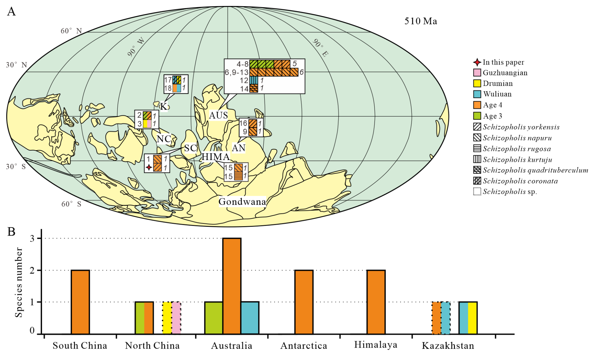Figure 6Palaeogeographical distribution and diversity of Schizopholis in the Cambrian. (A) Palaeogeographical distribution of Schizopholis species during the Cambrian Age 3 to the Guzhangian Age: italic numbers represent the abundance of Schizopholis, and roman numbers indicate the literature numbers (palaeogeographic reconstruction is modified from Torsvik and Cocks, 2017; Yang et al., 2015). (B) Diversity of Schizopholis during the Cambrian Age 3 to the Guzhangian Age. Abbreviations: NC – North China, SC – South China, K – Kazakhstan, AUS – Australia, AN – Antarctica, HIMA – Himalaya. Literature numbers: (1) Liu et al. (2020), (2) Pan et al. (2019), (3) Hu et al. (2021), (4) Betts et al. (2019), (5) Jago et al. (2006), (6) Brock and Cooper (1993), (7) Betts et al. (2016), (8) Gravestock et al. (2001), (9) Holmer et al. (1996), (10) Smith et al. (2015), (11) Kruse (1990), (12) Kruse (1998), (13) Kruse (1991), (14) Percival and Kruse (2014), (15) Popov et al. (2015), (16) Claybourn et al. (2020), (17) Holmer et al. (2001), (18) Popov et al. (2021).