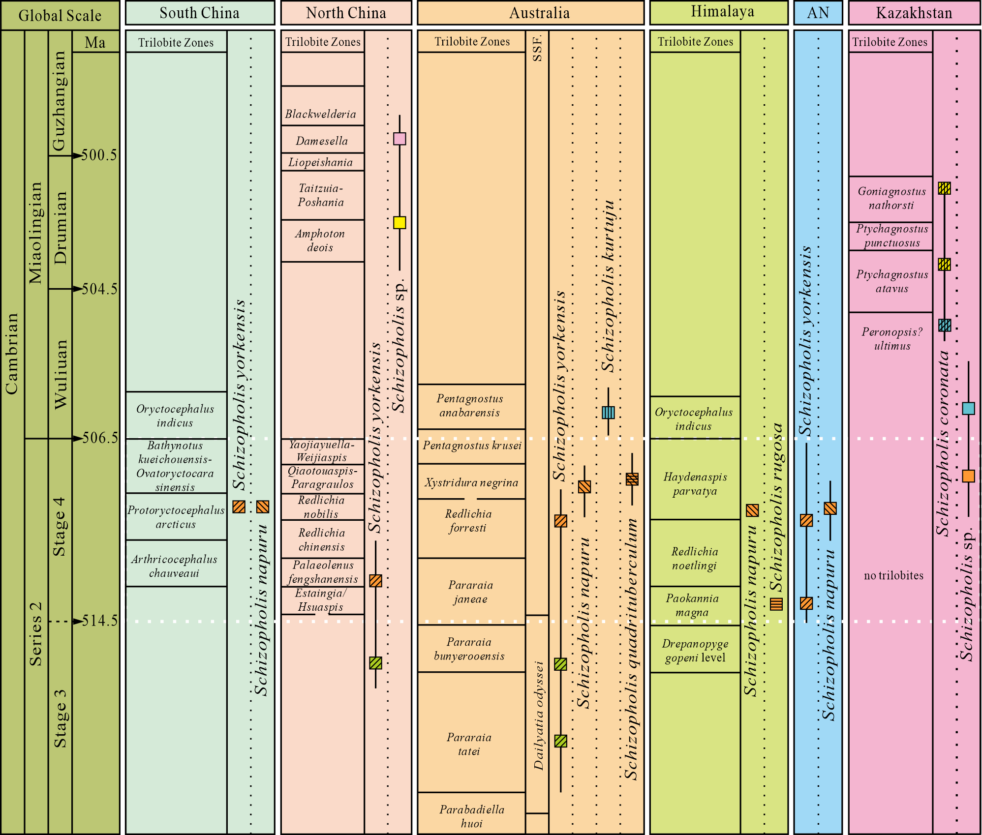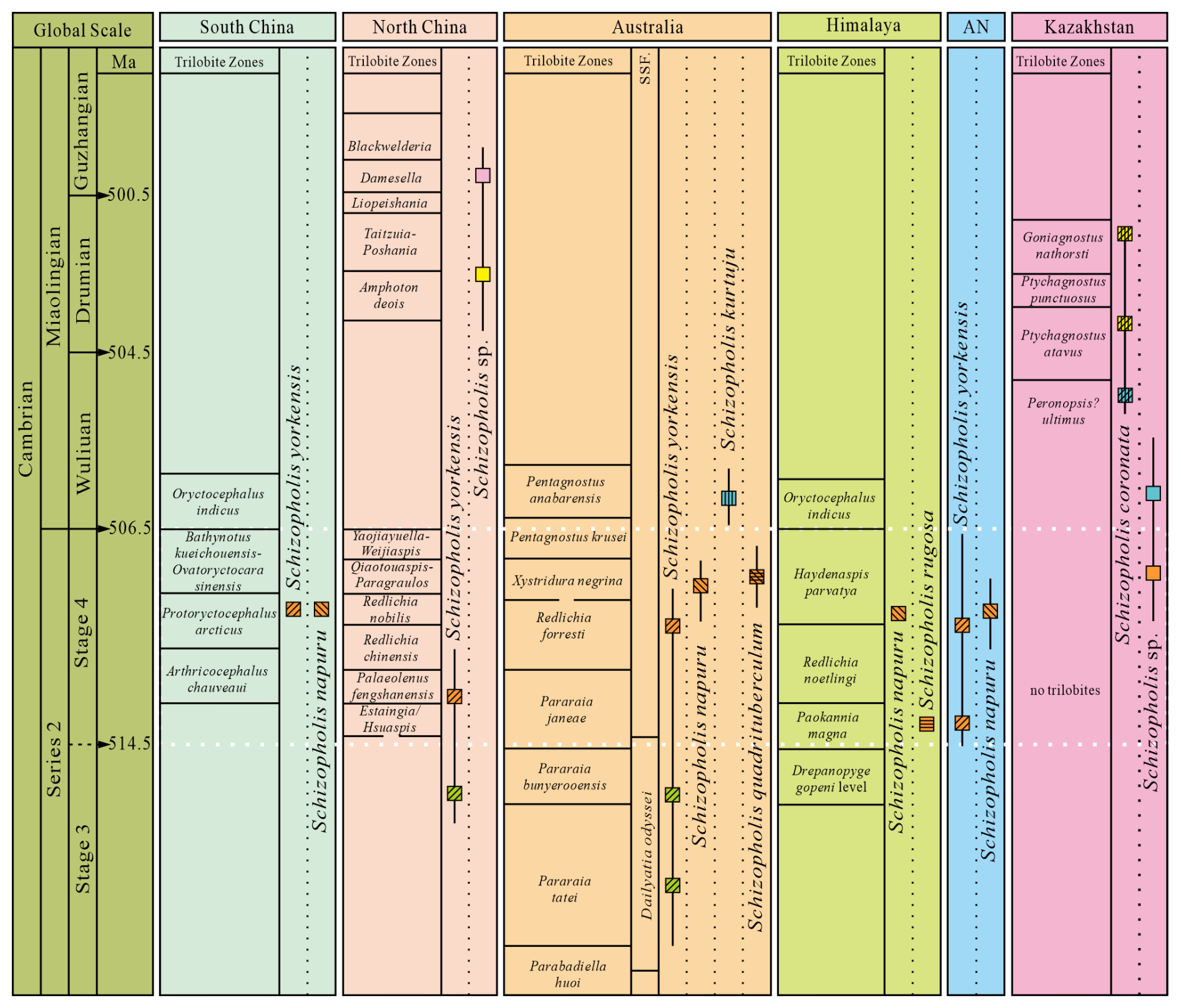 Figure 7The distribution and occurrence horizon of Schizopholis from the Cambrian Stage 3 to Guzhangian (Trilobite zone date from Peng et al., 2009; Popov et al., 2015; Zhu et al., 2019; Zhao et al., 2019; Geyer, 2020). Abbreviations: AN – Antarctica, SSF – small shelly fossil.
