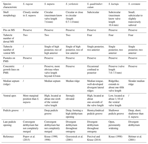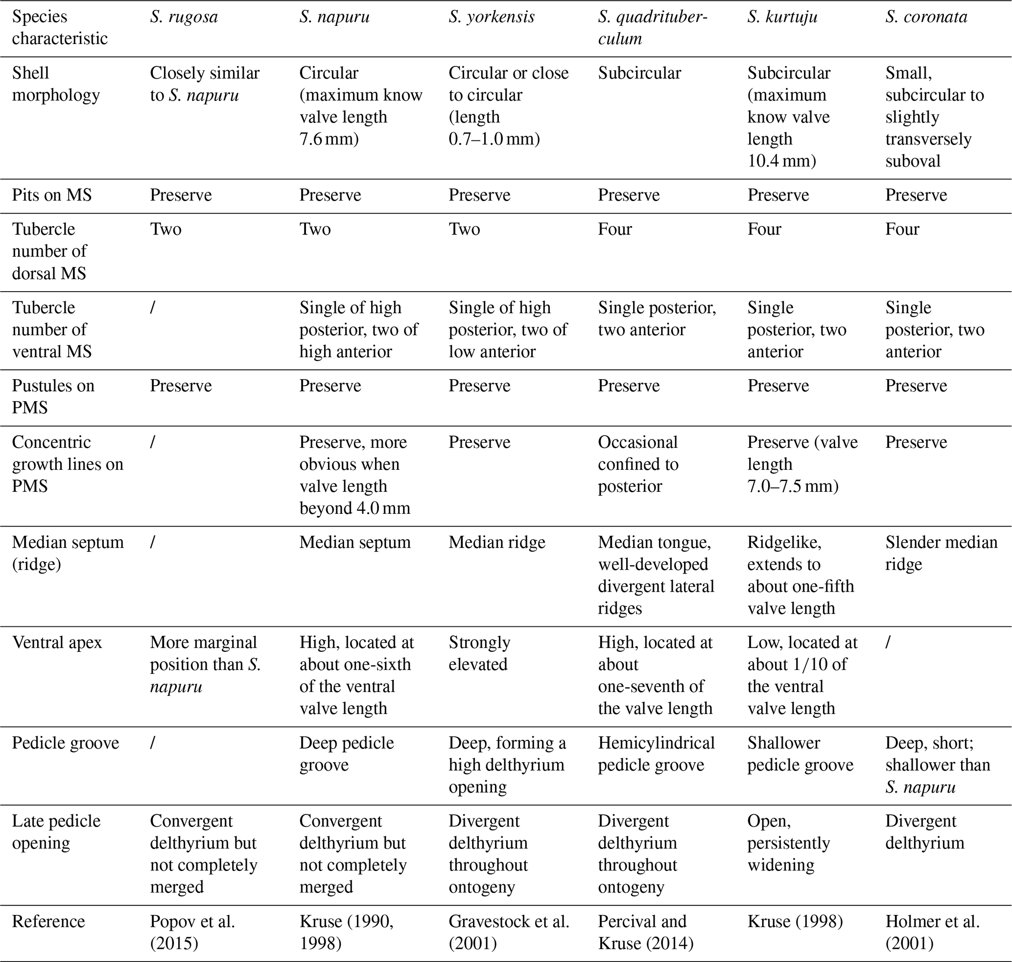 Remarks. The morphological variability of Schizopholis is mainly in the number of tubercles on the metamorphic shell and the character of the pedicle opening (Kruse, 1990, 1998; Holmer et al., 1996, 2001; Gravestock et al., 2001; Percival and Kruse, 2014; Popov et al., 2015; Claybourn et al., 2020). Schizopholis yorkensis is similar to the type species S. rugosa and S. napuru in having two tubercles on the dorsal metamorphic shell and differs in having divergent delthyrium throughout the ontogeny of the ventral valve, while the latter two species have convergent delthyrium in the late pedicle opening but with a not completely merged margin (Table 3). Schizopholis yorkensis also has a wider triangular delthyrium (Smith et al., 2015) and a smaller maximum size (Gravestock et al., 2001) as opposed to S. napuru. Additionally, S. yorkensis is similar to the species S. coronata, S. quadrituberculum, and S. kurtuju in having divergent delthyrium throughout its ontogeny, while the latter three species have four tubercles on their dorsal metamorphic shell (Table 3).
