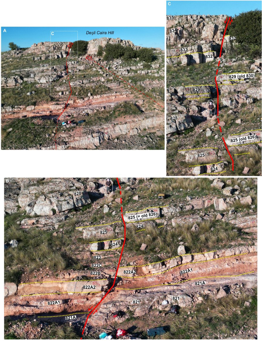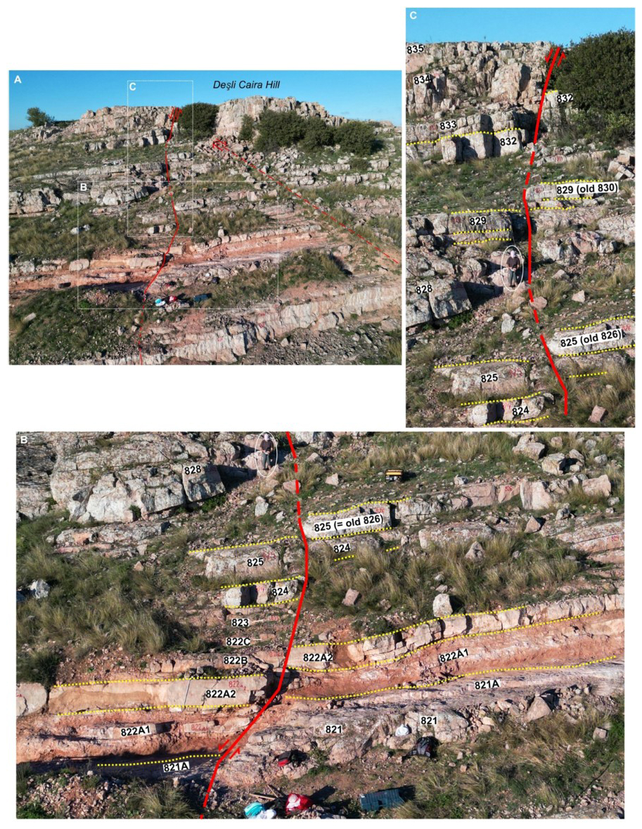 The fault is visible and easy to walk on along the slope of Deşli Caira Hill from the middle part of the section to the top (Balini et al., 2024, fig. 4; Figs. 1 and 2). Contrarily to what is reported by Golding, the fault is also visible between beds 822A2 and 822B, as shown in Balini et al. (2024, figs. 4, 5B; Figs. 1B and 2). This issue can be solved by comparing the thickness of beds 822A2 (right of fault) and 822B (left of fault), colour, and distribution of macrofossils within the beds from one side of the fault to the other side.