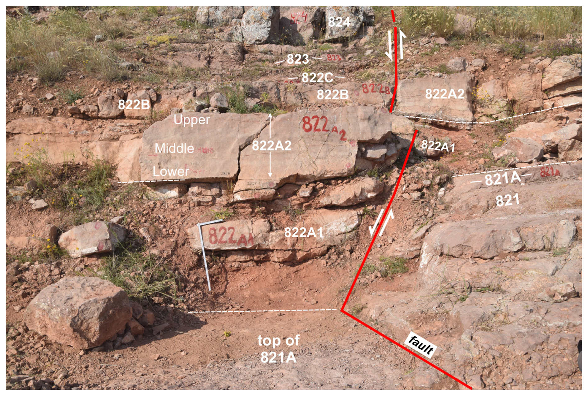See p. 368, caption of fig. 2. “Note that Balini et al. (2024) indicate the presence of a fault within bed 822B, which appears to be a crack within the bed to the left of the arrow labelling this bed.”